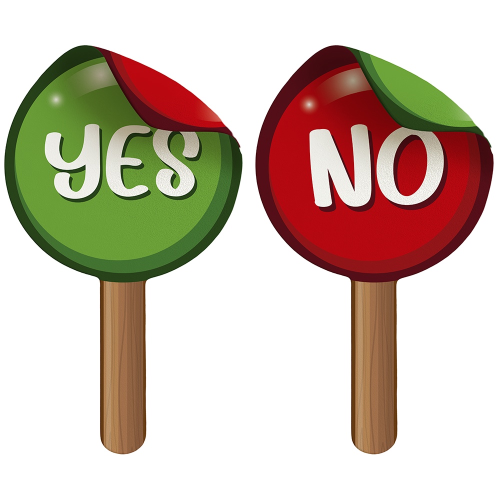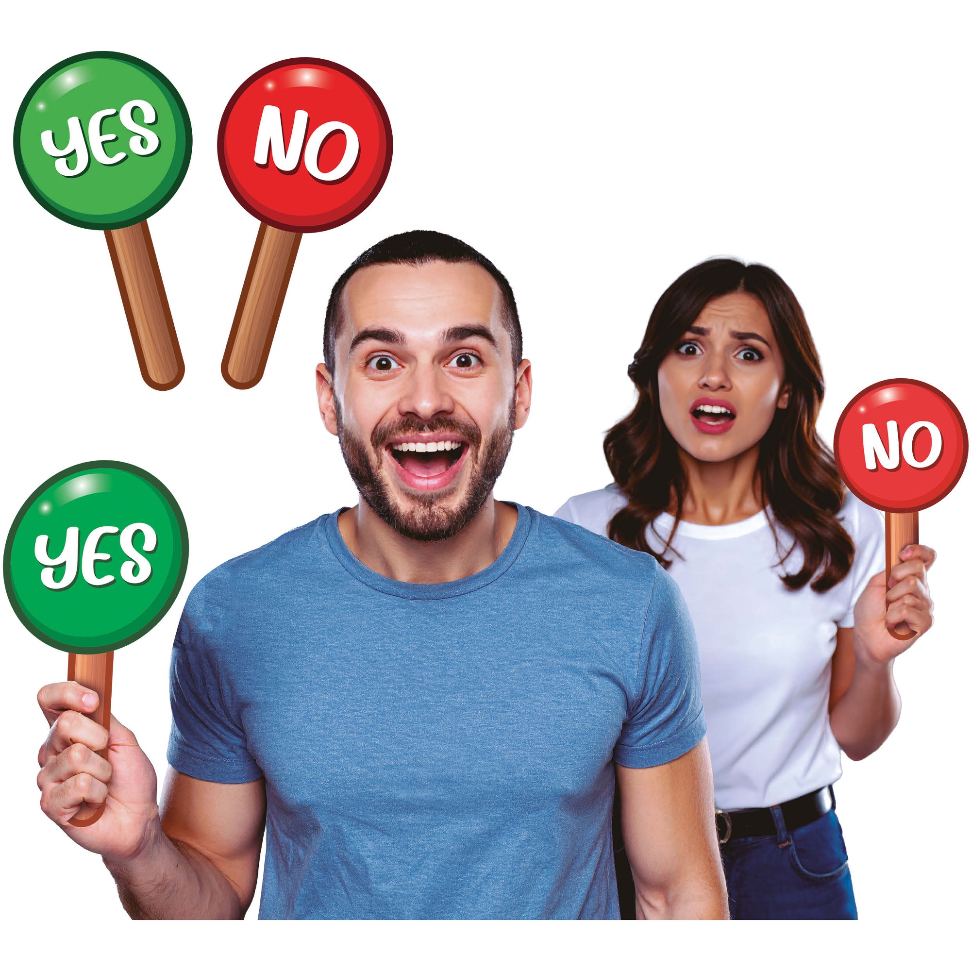Handschilder "Yes" und "No", konzipiert, um Ihren Fotos und Event?Dynamiken einen spielerischen und ausdrucksstarken Akzent zu geben. Gedruckt auf Papier mit kräftigen Farben und gut lesbarer Typografie für maximale Lesbarkeit. Praktische Größe 13 x 25 cm - leicht und bequem von Ihnen zu halten. Das Design ermöglicht schnelle Antworten und sorgt für Schwung in Fotoboxen, Hochzeiten, Geburtstagen und weiteren Zusammenkünften.