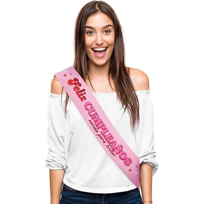 Wunderschönes Band mit der Aufschrift Happy Birthday born to shine, das sich durch seine leuchtenden Farben in einigen Buchstaben auszeichnet. Inklusive rosa Band, das man unten am Band befestigen und so die Größe des Bandes leicht an den Körper anpassen kann.