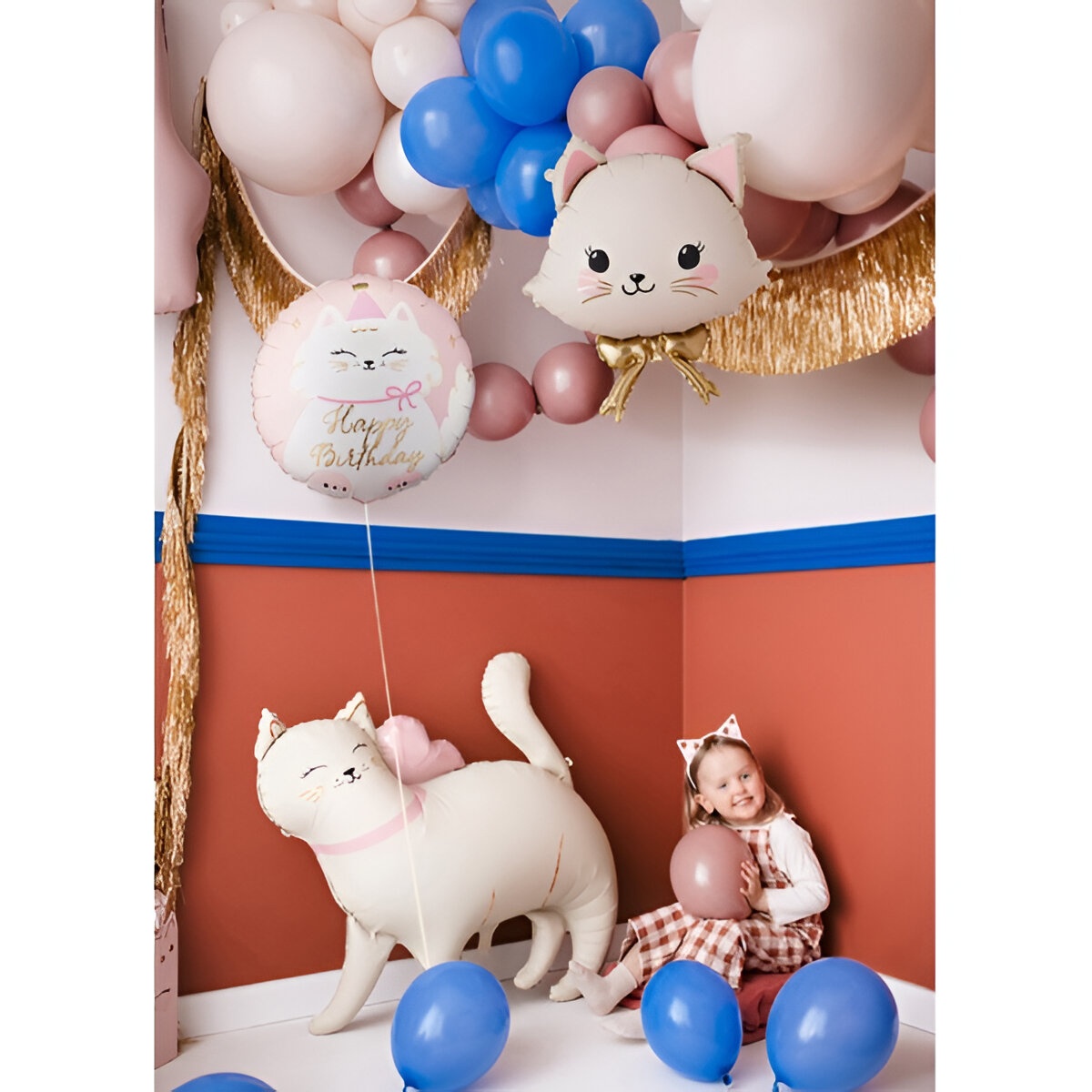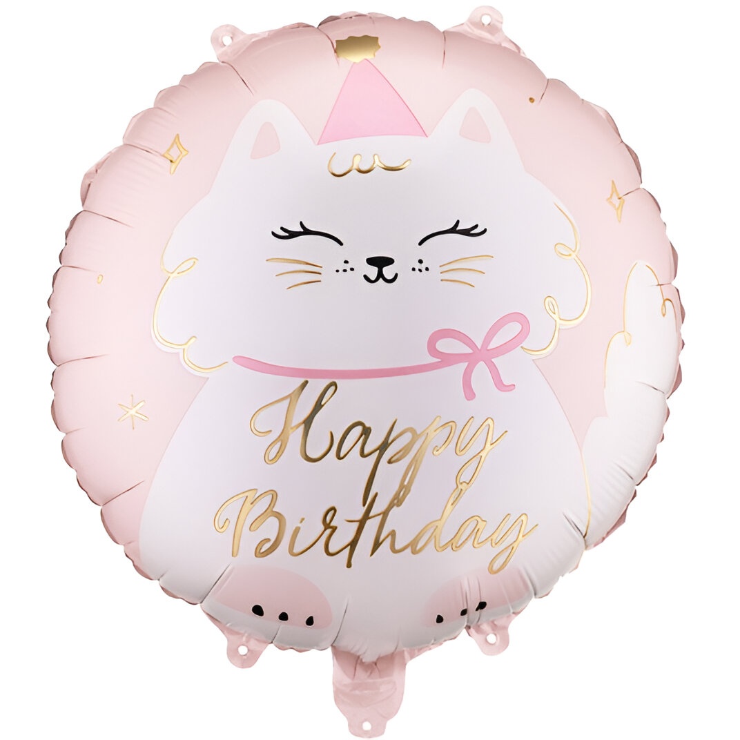 Runder Folienballon in Scheibenform mit einem niedlichen Katzenmotiv und der Aufschrift "Happy Birthday" in goldenen Details. Sanfte Pastelltöne, speziell für Kinderfeiern abgestimmt.