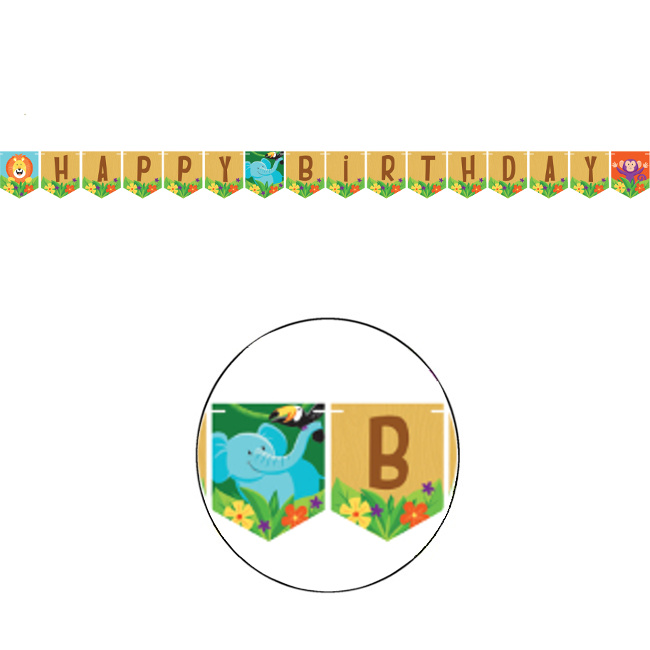 Hübsche Geburtstagsgirlande mit Dschungelbildern und niedlichen Tieren, die die Kleinen so sehr lieben.