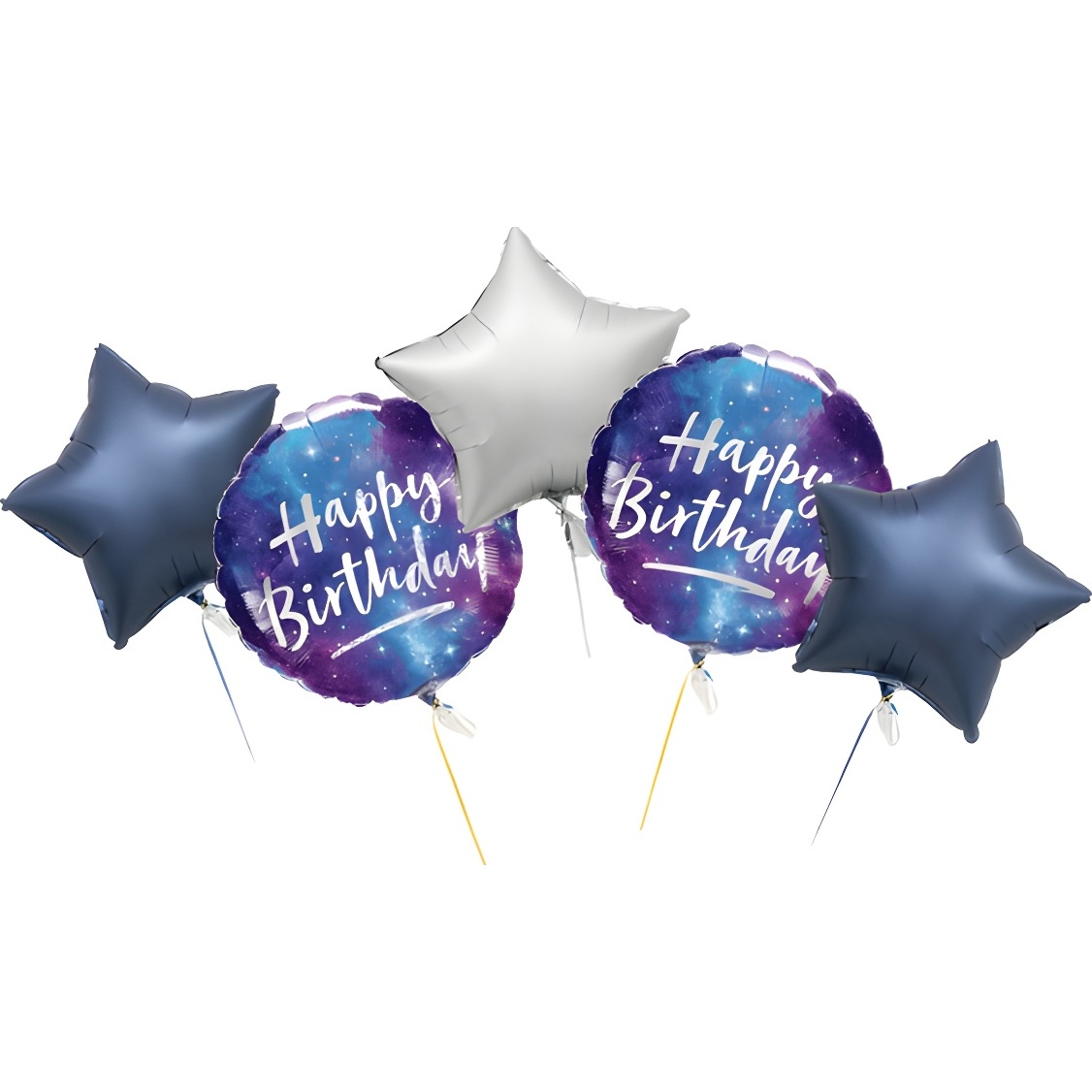 Enthält 2 gemusterte Luftballons, 2 blaue Sternballons und 1 silbernen Sternballon.