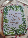 Dieses Produkt enthält 2 rechteckige Tabletts aus Pappe mit einem tropischen Blätterdruck auf weißem Hintergrund und dem Schriftzug "Enjoy the little things" in goldener Farbe und kalligraphischem Stil.