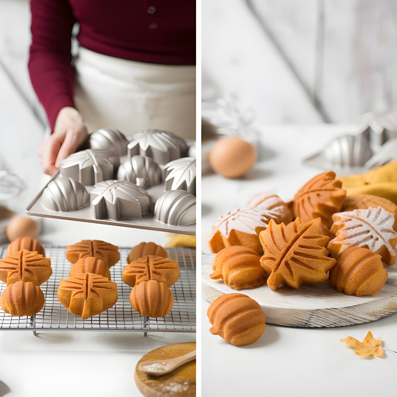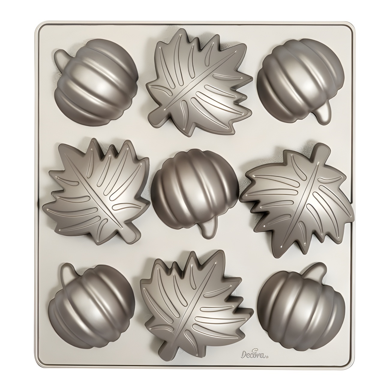 Eine Form zur Herstellung von herbstlichen Torten mit Blättern und Kürbissen.
