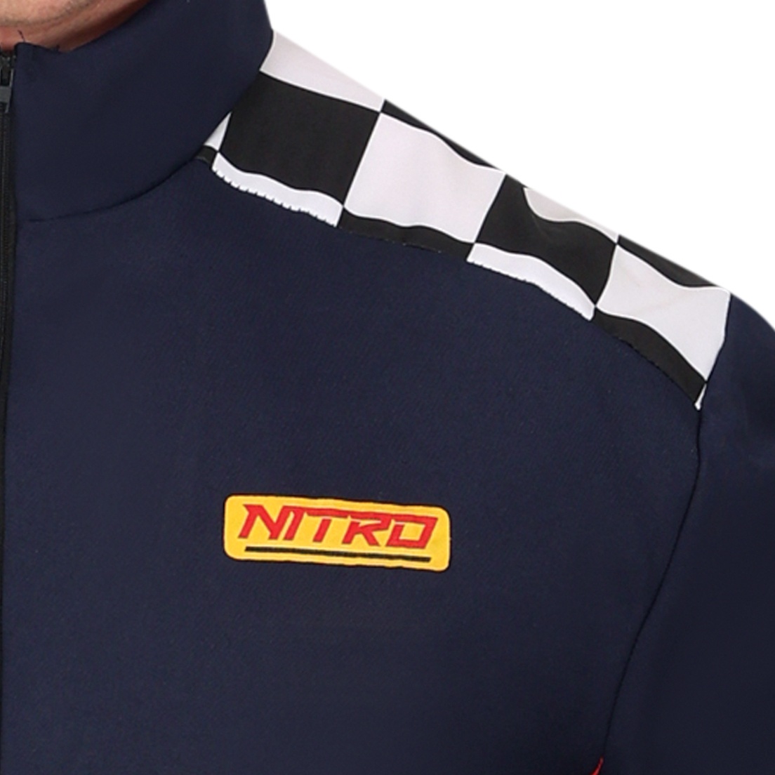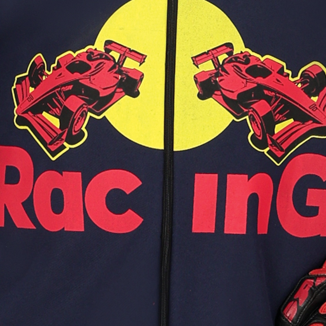 Herren Rennfahrer-Kostüm. Es besteht aus einem langärmeligen Overall, der vorne mit einem Reißverschluss geschlossen wird.