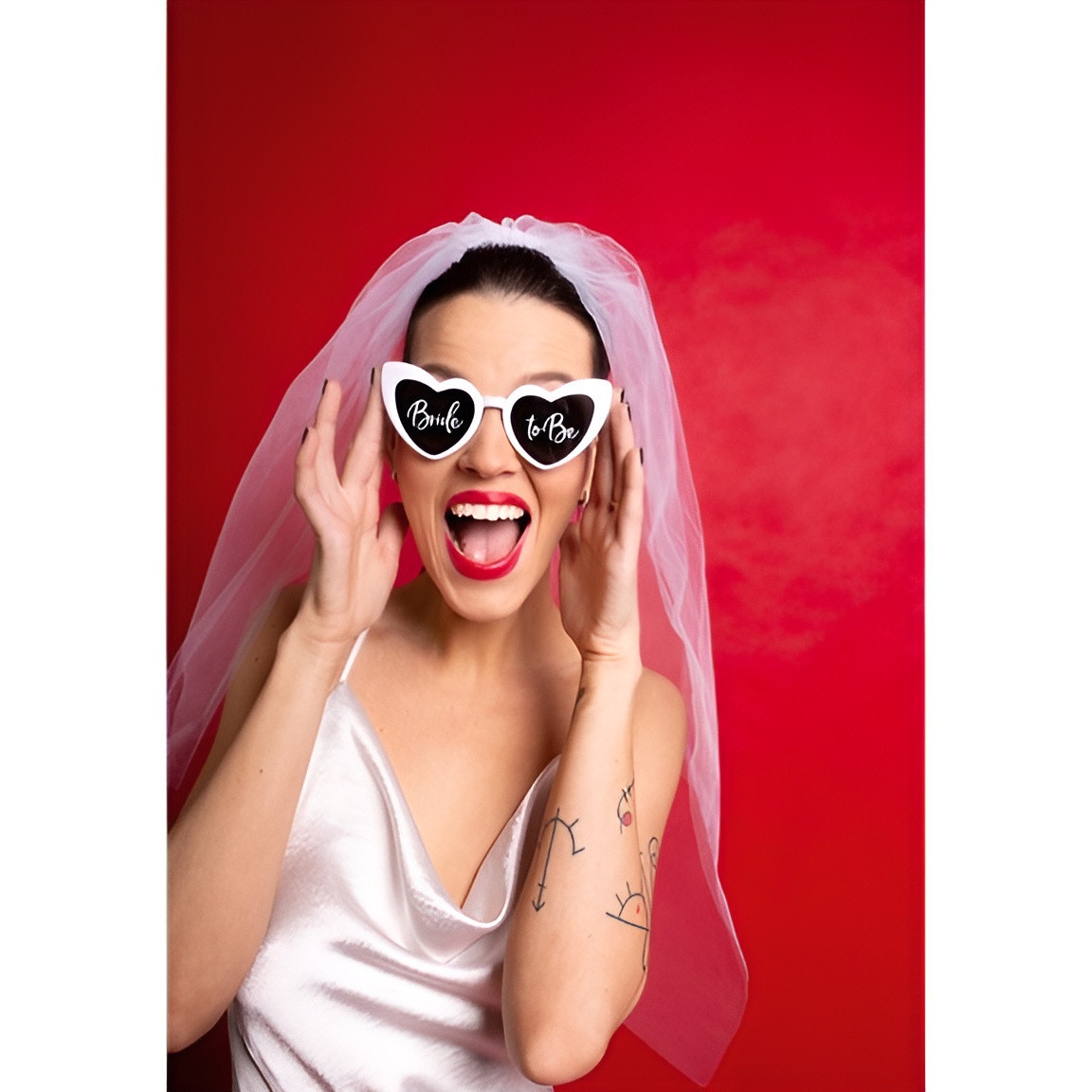 Herzförmige Brille mit der Aufschrift "Bride to Be" in kontrastierendem Weiß und schwarzen Gläsern für einen eleganten und frechen Akzent. Das auffällige Design ist speziell für Junggesellinnenabschiede und feierliche Anlässe gedacht. Die kompakten Maße sorgen für einen bequemen und sicheren Sitz während der Party - so sind Sie bereit für tolle Fotos und eine unvergessliche Stimmung.