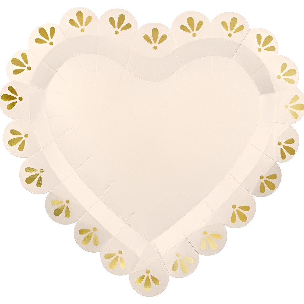 Pappteller in Herzform in Creme mit goldenen Details, die eine romantische und zugleich raffinierte Note verleihen. Das edle Finish hebt die Tischpräsentation bei Hochzeiten und formellen Feiern hervor. Die Größe eignet sich für Vorspeisen, Desserts und kleine Häppchen und sorgt für eine gepflegte Optik. Als Einwegprodukt erleichtern diese Teller Ihnen das Eindecken und den Service bei Veranstaltungen, ohne auf Stil verzichten zu müssen.