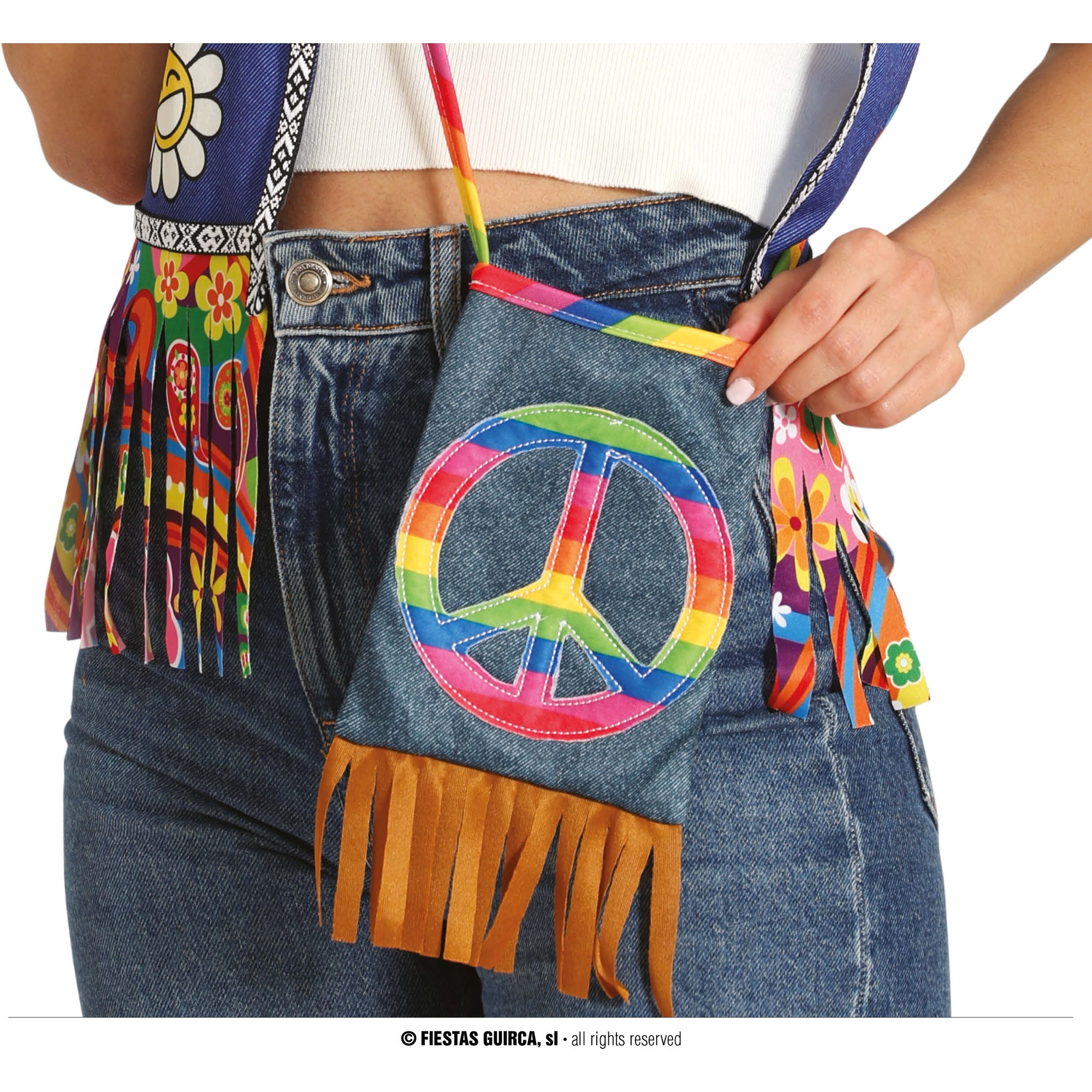 Ideales Accessoire für Hippie-Looks und Kostüme. Retro-Umhängetasche mit aufgenähtem Peace-Symbol in leuchtenden Farben und Fransen am unteren Rand. Hergestellt aus strapazierfähigem, pflegeleichtem Polyester. Kompakte Maße von 27 x 15 cm - perfekt, um Ihre wichtigsten Dinge auf Partys, beim Karneval oder auf Festivals mitzunehmen. Umhängeriemen für Schulter- oder Crossbody-Trageweise, der Komfort bietet und jedem Outfit einen Boho-Touch verleiht.