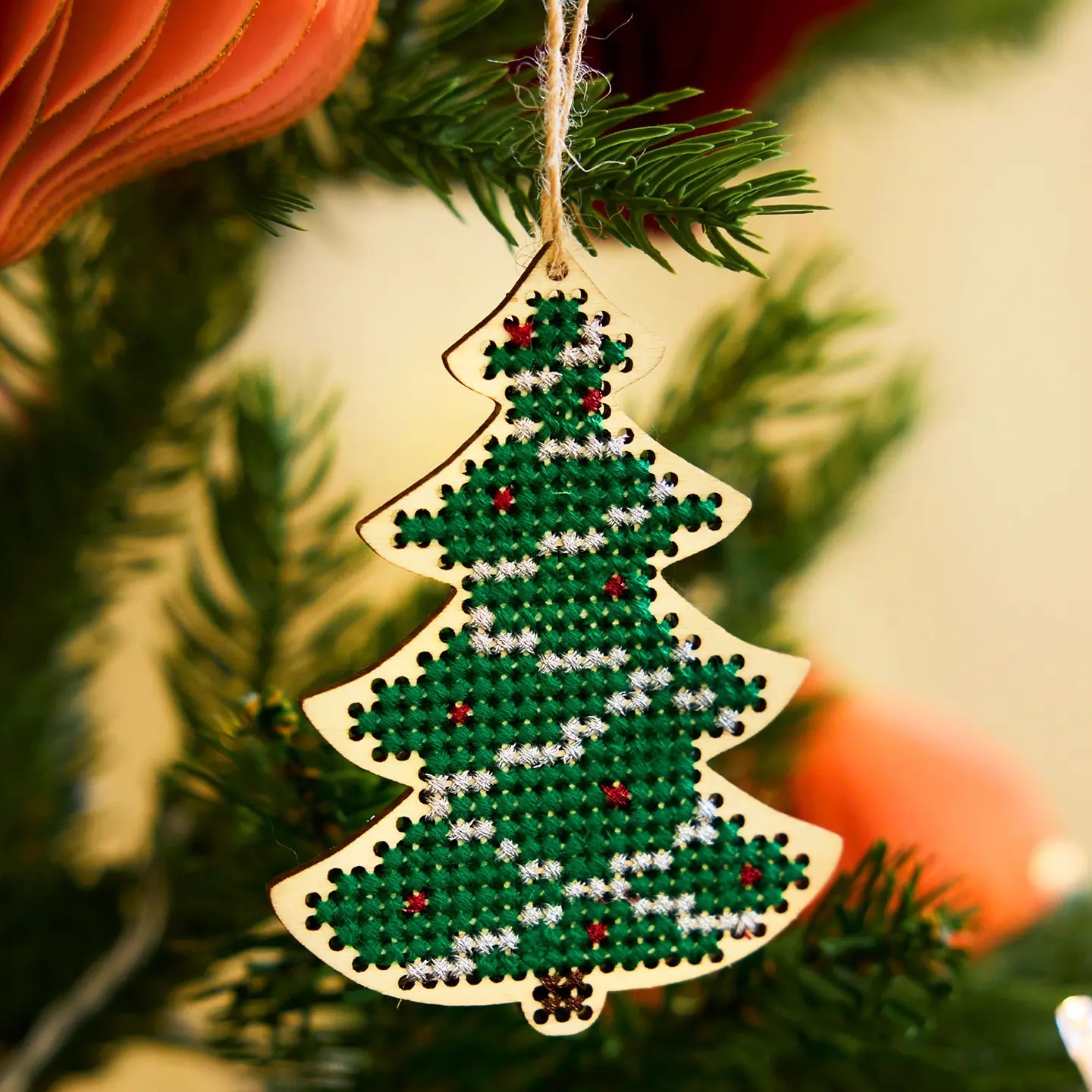 Besticken Sie Ihre eigenen Weihnachtsschmuck in Baumform, perfekt um Ihren Weihnachtsbaum oder jede andere saisonale Dekoration kreativ zu ergänzen.