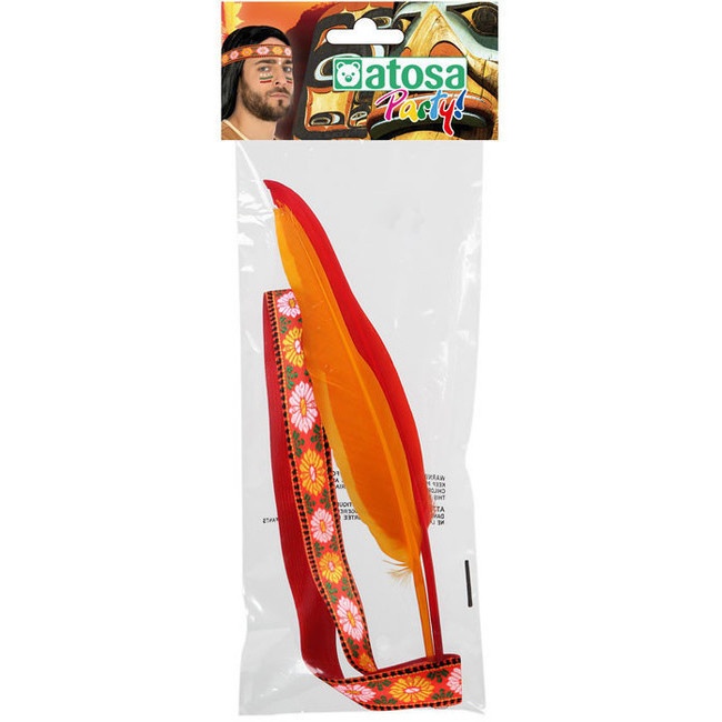 Auf einer Seite des Stirnbandes befinden sich zwei Federn, eine rote und eine gelbe, die ihm den letzten Schliff geben.
