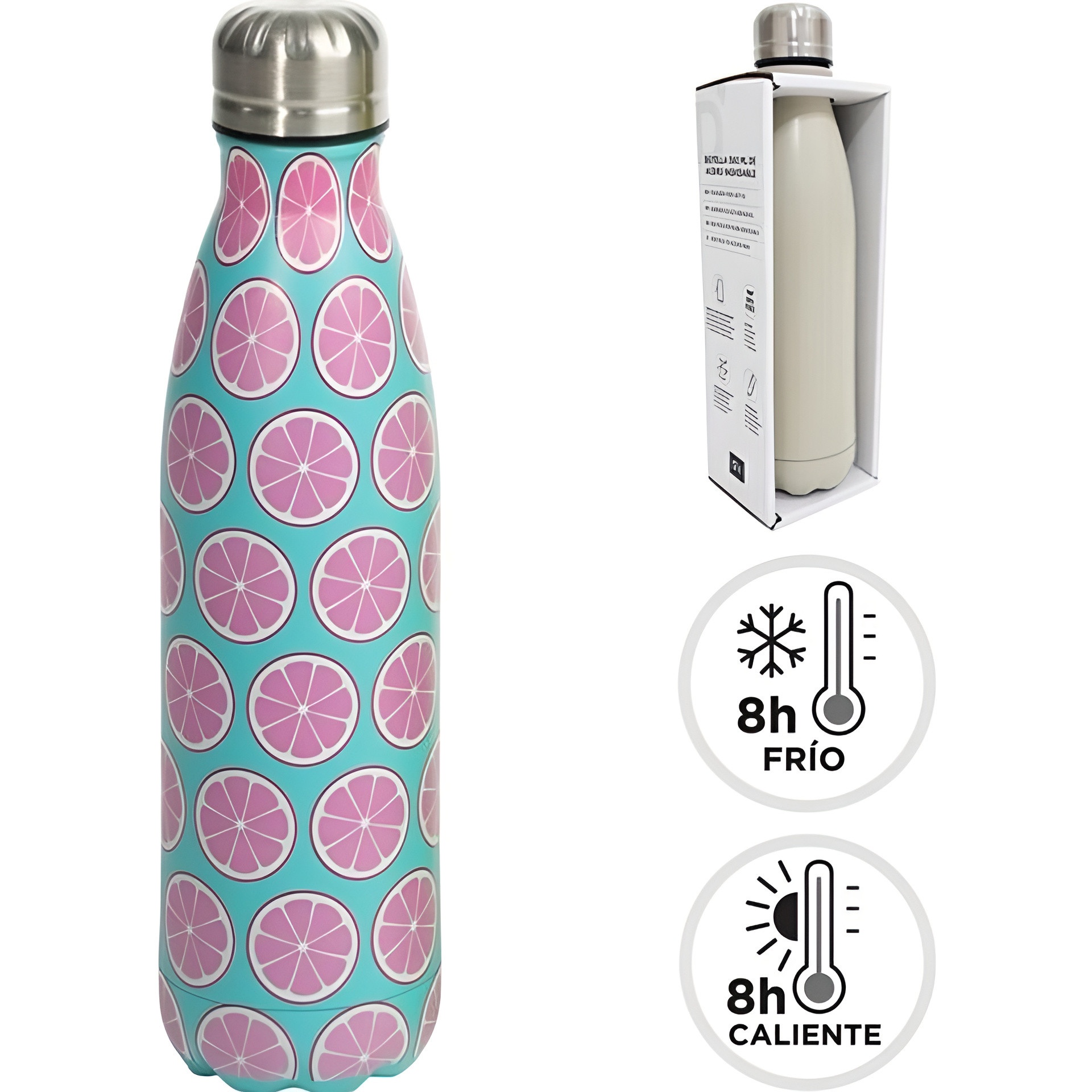Isolierflasche mit fröhlichem Fruchtmuster, ideal, um Ihre Lieblingsgetränke stilvoll mitzunehmen. Modernes, farbenfrohes Design, das Ihrem Alltag eine verspielte Note verleiht. Leicht und bequem zu transportieren - perfekt für Büro, Fitnessstudio oder Aktivitäten im Freien.