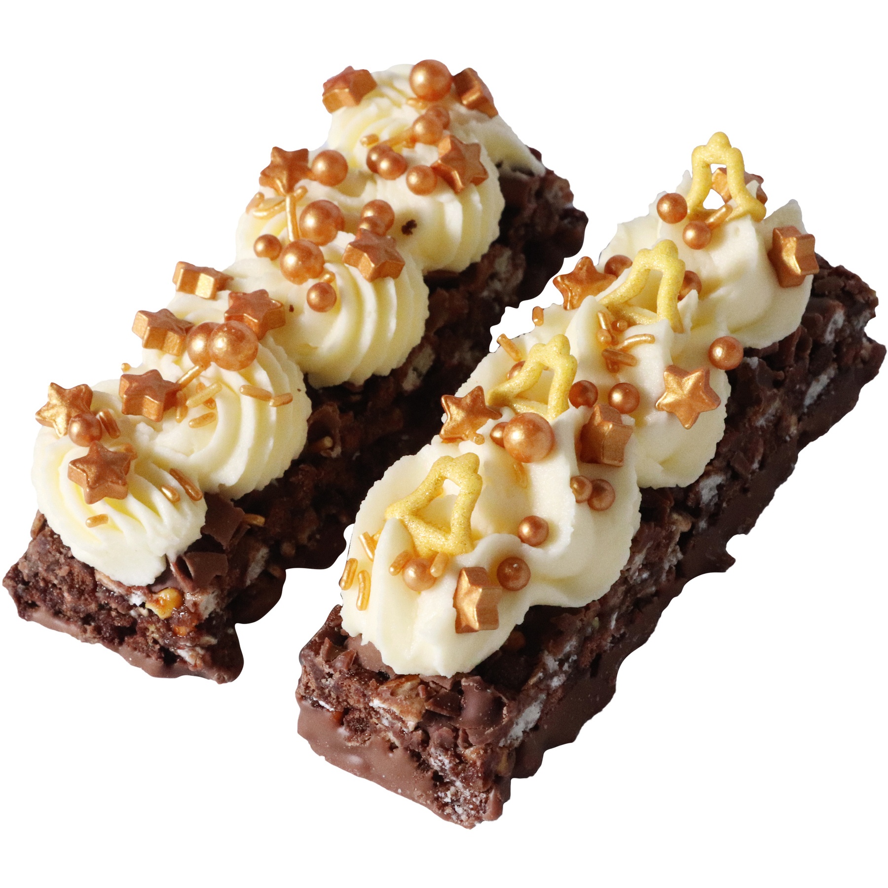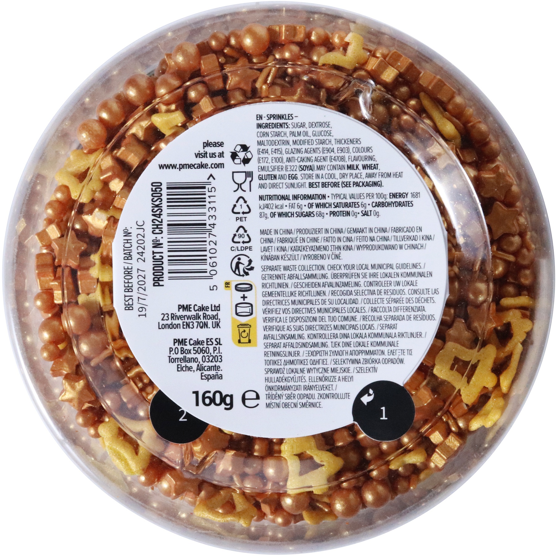 - 160 g Streusel in einer fröhlichen Mischung aus Sternen, Perlen, Jimmies und Jingle Bells, mit einem goldenen Thema.