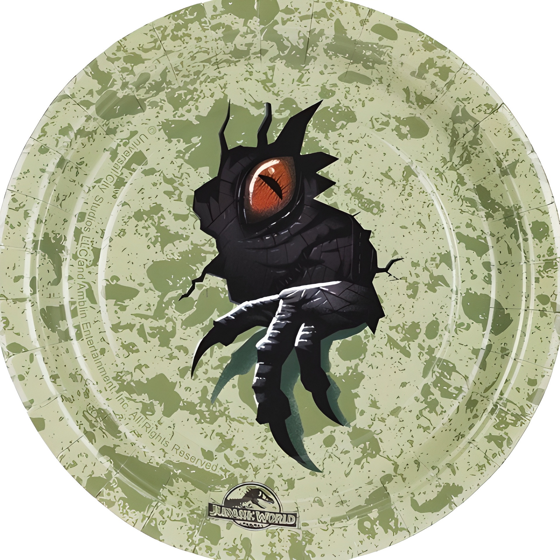 Jurassic World-Pappteller in runder Form mit einem von der Saga inspirierten Motiv - perfekt, um Kindertische mit Dinosaurier-Designs zu gestalten. Durchmesser ca. 18 cm; Farbmix und auffälliges Finish, das in der Dekoration hervorsticht.