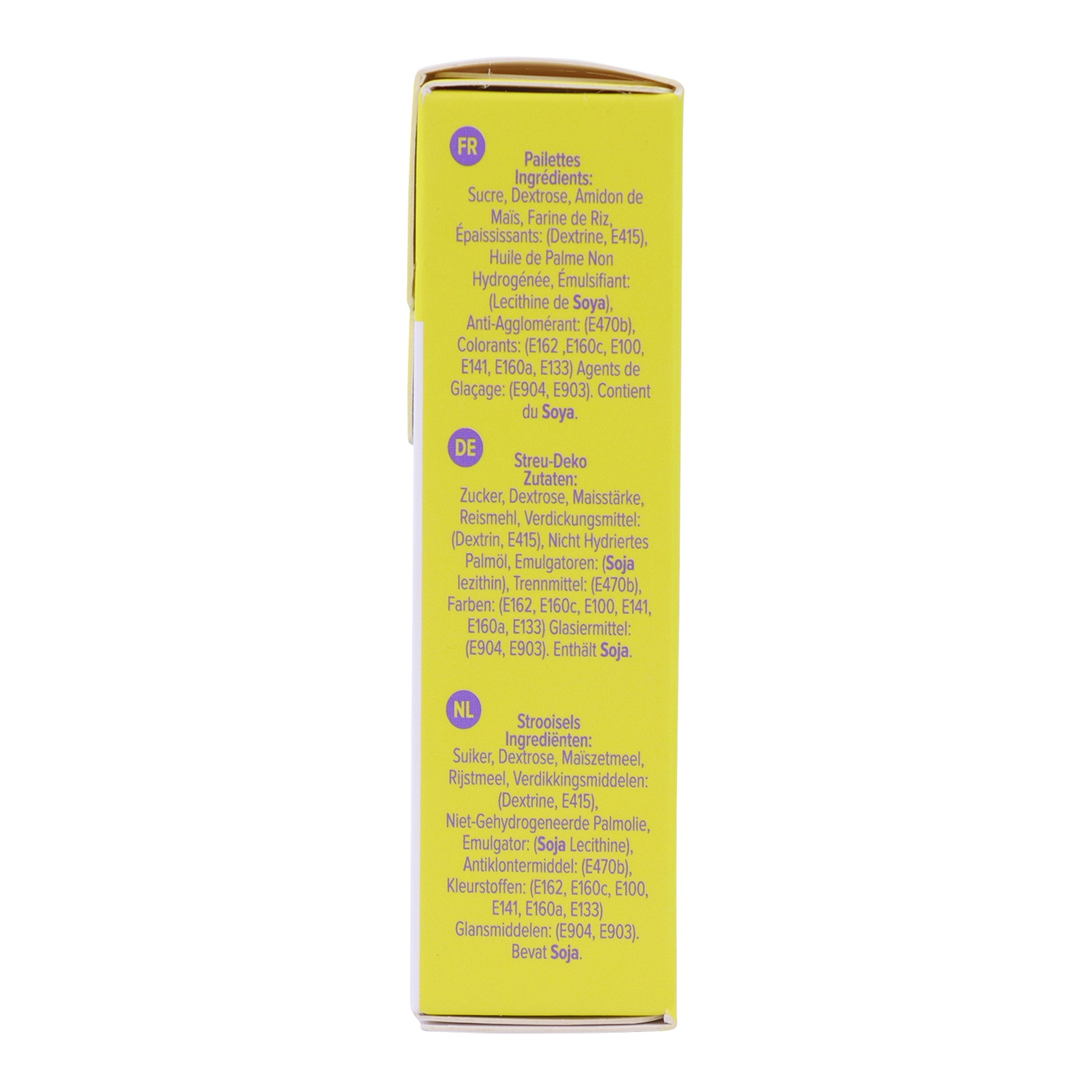Zutaten: Zucker, Dextrose, Maisstärke, Reismehl, Verdickungsmittel (Dextrin, E415), ungehärtetes Palmöl, Emulgatoren:(Sojalecithin ), Antiklumpmittel (E470b), Farbstoffe (E162, E160c, E100, E141, E160a, E133), Überzugsmittel (E904, E903).
