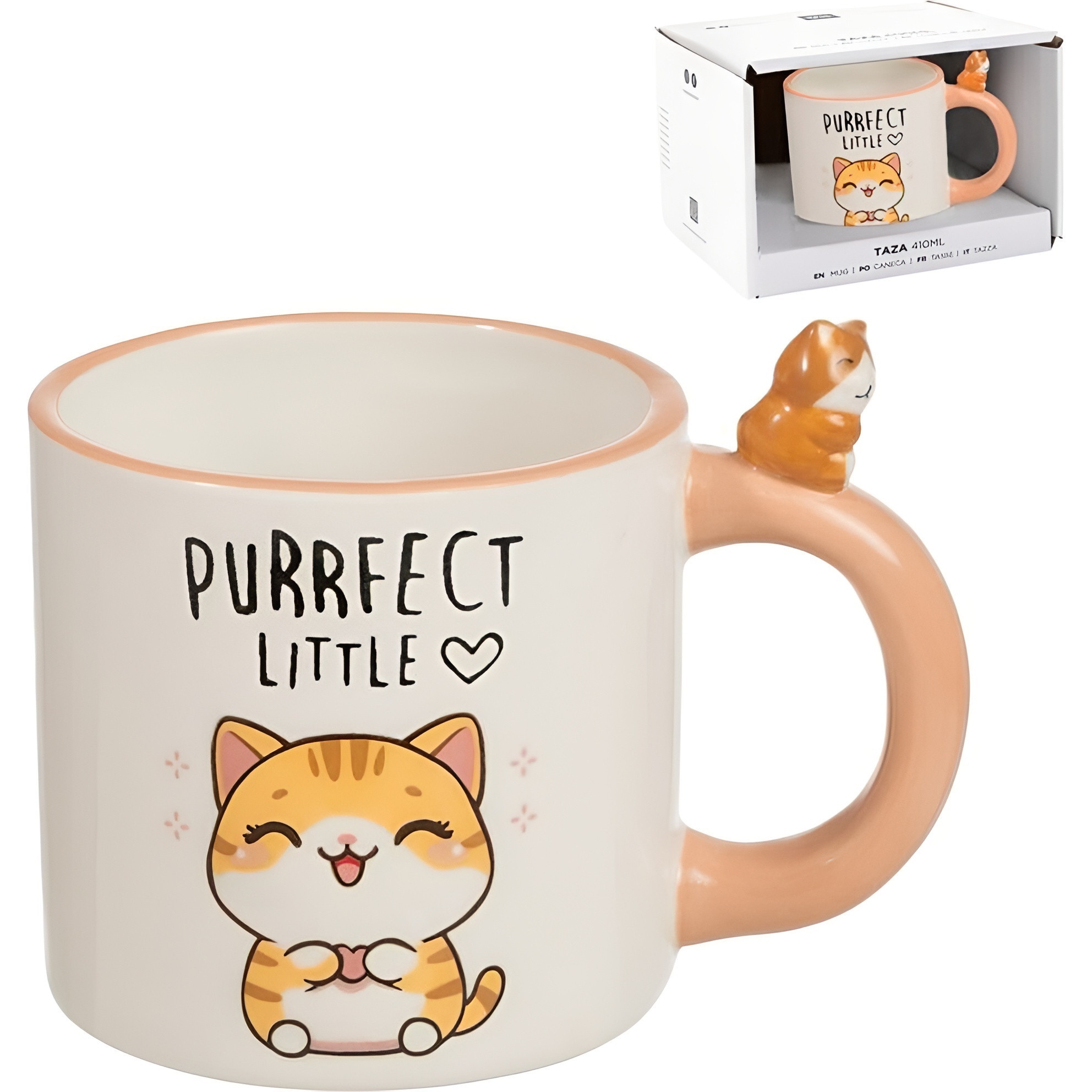 Tasse mit kawaii-Kätzchen-Design und Henkel mit einer kleinen Zierfigur, die sie einzigartig und sympathisch macht.