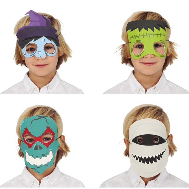 Mit diesen Kindermasken werden Kinder an Halloween eine tolle Zeit haben. Sie haben die Form verschiedener klassischer Horrorfilm-Monster wie die Mumie, Frankenstein, die Hexe oder ein Zombie.