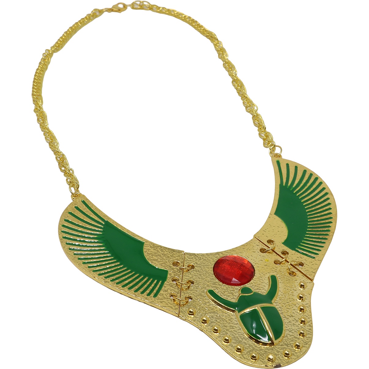 Diese Halskette im ägyptischen Stil ist von Kleopatra inspiriert. Das geflügelte Design mit grünen Details und einem zentralen roten Schmuckstein verleiht Ihrem Auftritt Farbe und Eleganz. Ideal, um Ihr ägyptisches Königinnen-Kostüm bei Karneval, Themenpartys, im Theater oder bei Fotoshootings zu vervollständigen. Sie sorgt für einen sofortigen visuellen Effekt und betont jedes Outfit mit antikem Ägypten-Flair.