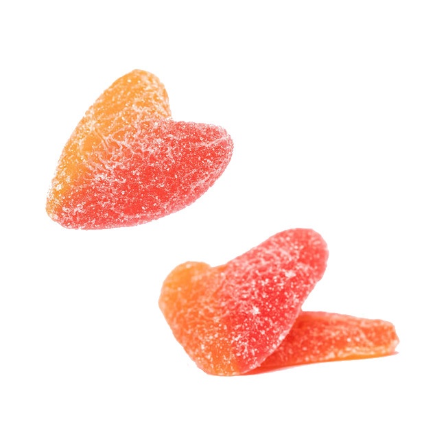 Zutaten: Zucker, Glukosesirup, Wasser, Gelatine, Fruchtfleisch 4% (Apfel, Antioxidationsmittel E300, Säuerungsmittel E330), Geliermittel: Pektin, Säuerungsmittel E330, Aroma (Pfirsich), Farbstoffe: E100, E120.