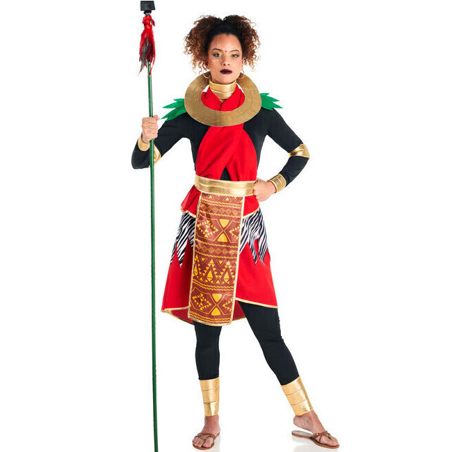Farbenfrohes Massai-Kostüm für Damen, das an Detailreichtum nichts zu wünschen übrig lässt.
