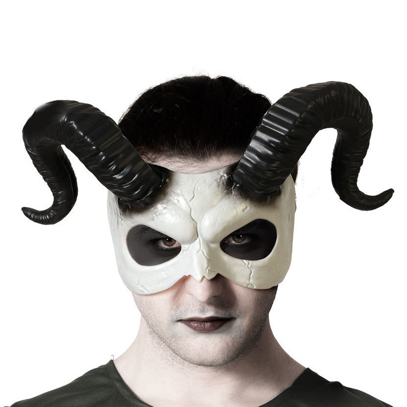 • Weißer, rissiger Augenmasken mit langen schwarzen Hörnern und durchdringendem Blick. Ideal für Kostüme als Dämon, magisches Wesen oder dunkler Faun.