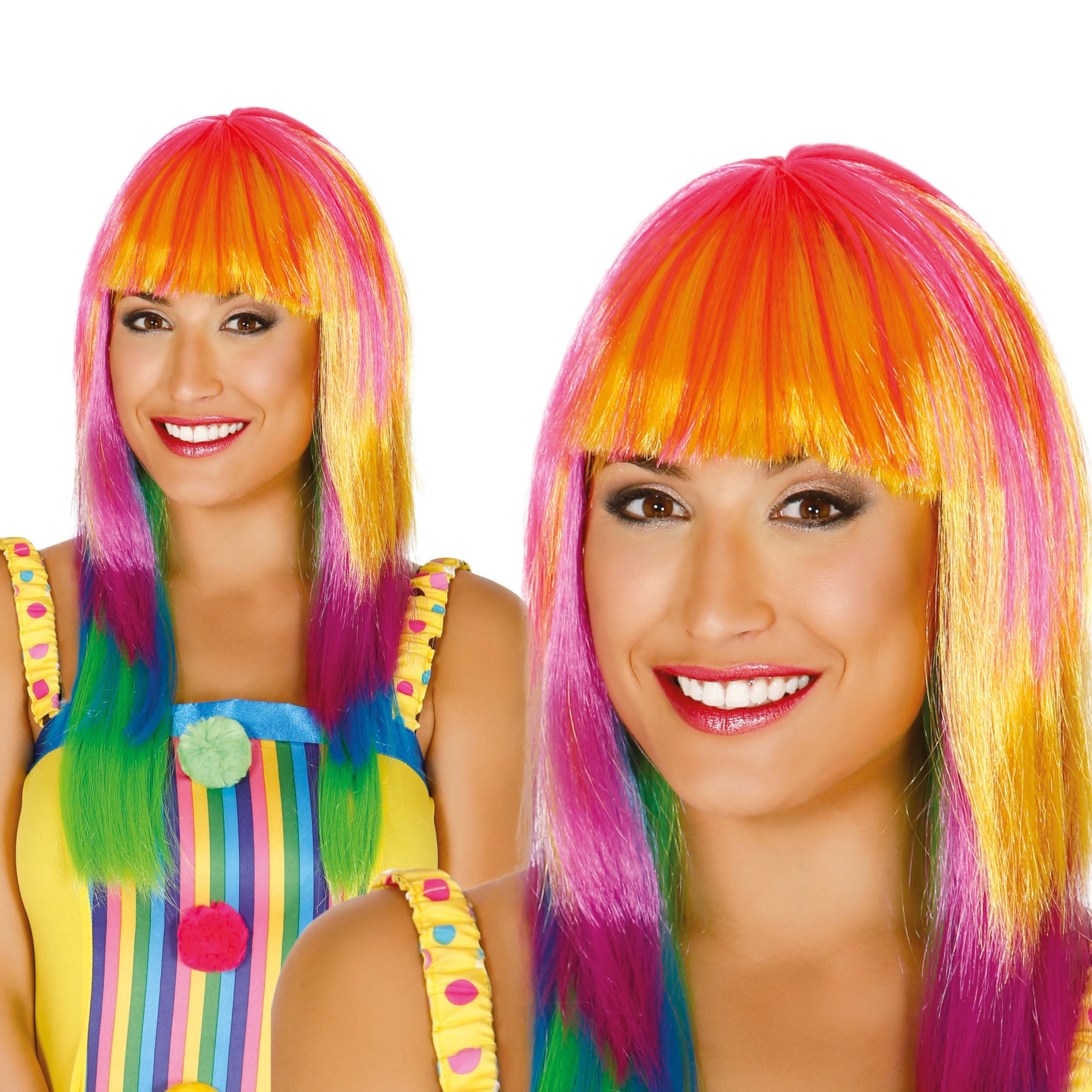 Bunte Perücke aus bunten Lagen und geraden Fransen.