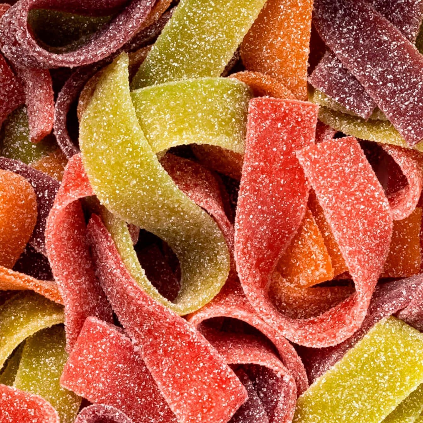 Zutaten: Zucker, Glukose-Fructose-Sirup, Weizenmehl (enthält Gluten), Säuerungsmittel: Äpfelsäure, Zitronensäure, Milchsäure; Dextrose, Palmfett, Maisstärke, Säureregulator: Natriummalate, Natriumlactat, Kaliumcitrate; Gemüsekonzentrat: Saflor, Spirulina, Apfel, Kürbis, Karotte, Heidelbeere, Schwarze Johannisbeere, Radieschen, Tomate; Aromen, Antioxidationsmittel: Ascorbinsäure; Salz.