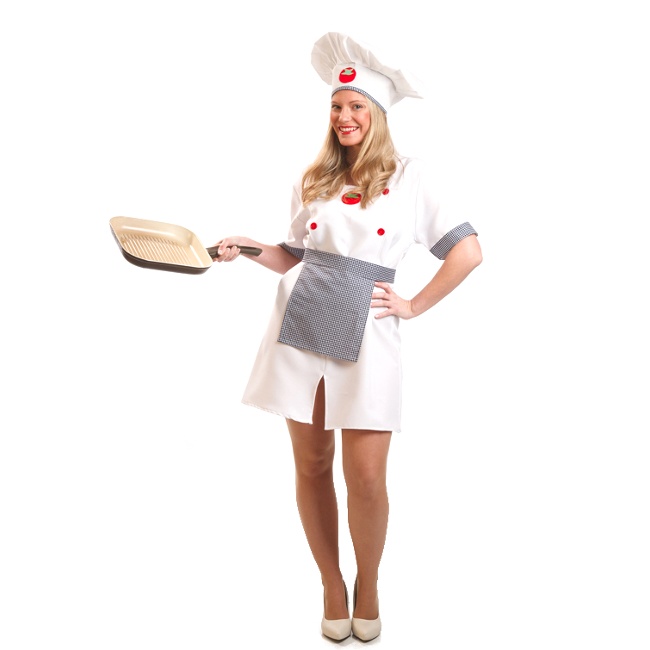 Das Kostüm besteht aus einem weißen Kleid mit einer kleinen Öffnung in der Mitte, das mit einer traditionellen Schürze aus schwarz-weiß kariertem Vichy-Stoff kombiniert wird. Das Kostüm ist mit Knöpfen und einer lustigen roten Tomate verziert, die zur Kochmütze passt.
