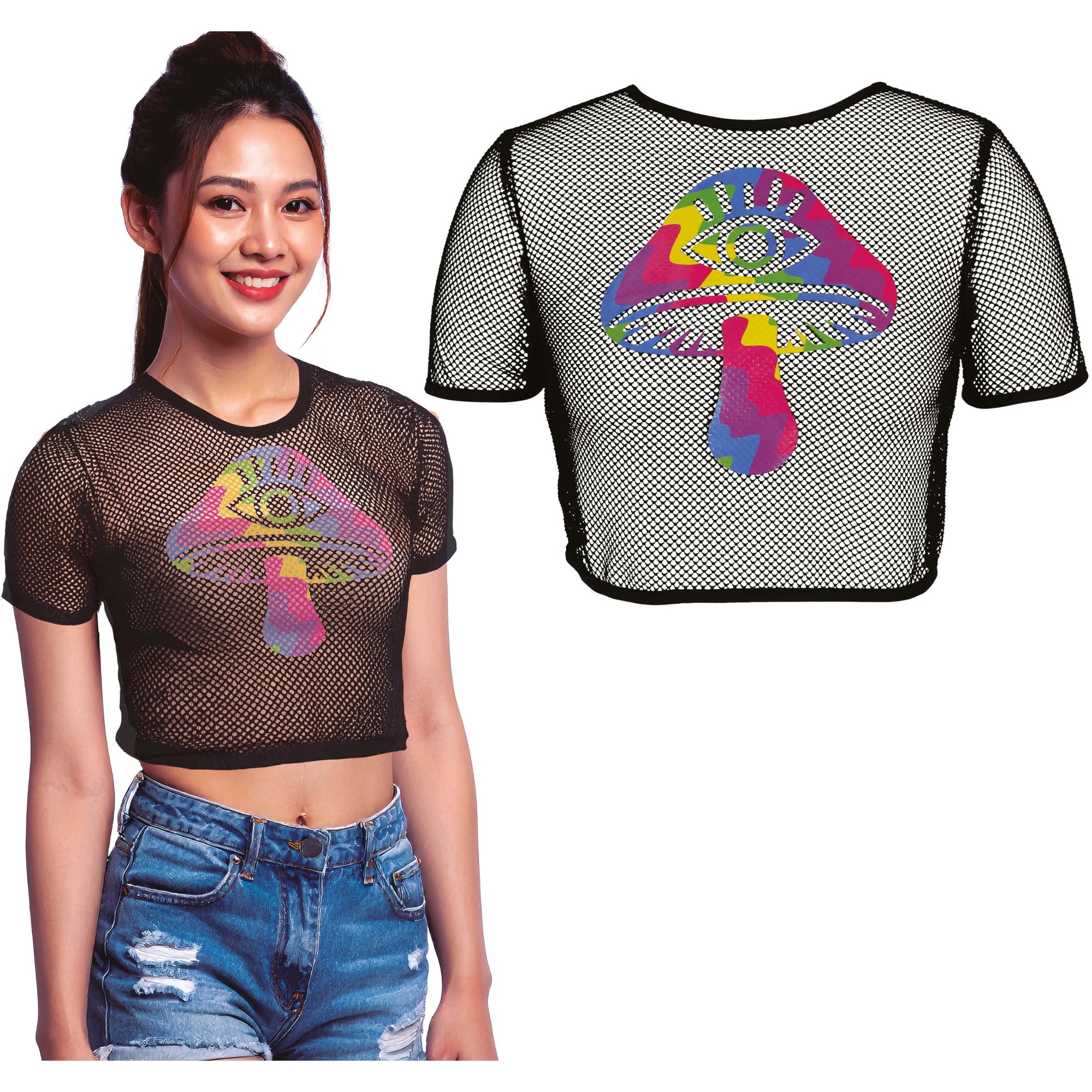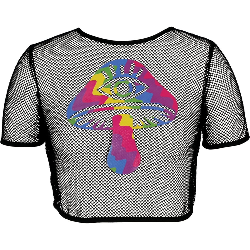 Cropped-Mesh-Top mit einem lebhaften, psychedelischen Pilzmotiv auf der Vorderseite.