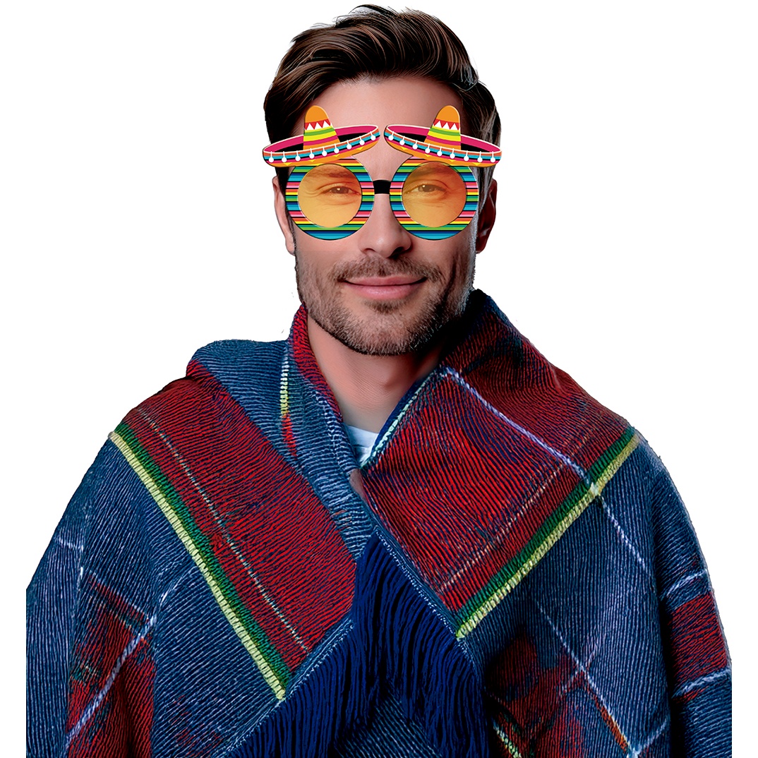 Festliche mexikanische Partybrille mit mehrfarbiger Fassung und integrierten Mini-Sombreros. Sie verleiht jedem Party- oder Photocall-Look einen auffälligen, lustigen Akzent. Aus leichtem PVC gefertigt für stundenlangen Tragekomfort. Unisex-Design, geeignet für Erwachsene und Kinder.
