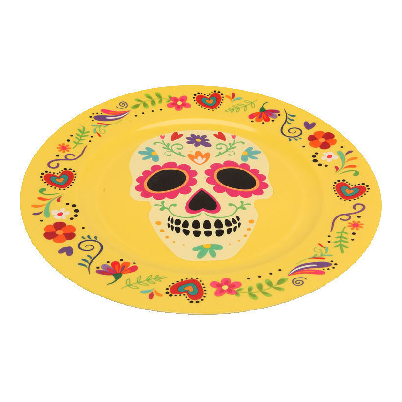 - Teller mit einem bunten Totenkopfdesign auf gelbem oder schwarzem Hintergrund.