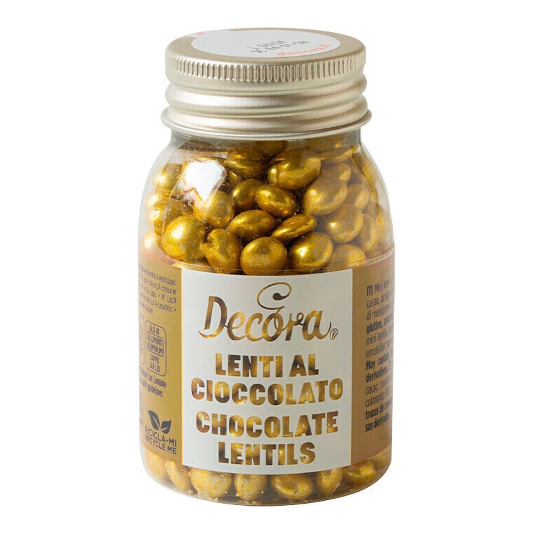 Goldene Zutaten: Zucker,Milchpulver, Kakaomasse, Kakaobutter, Reisstärke, Maltodextrin, Fischgelatine, Emulgator: Lecithin aus Soja; Aroma: Vanille; Farbstoffe: E174, E100, E102*; Kokosnussöl; Überzugsmittel: E904.