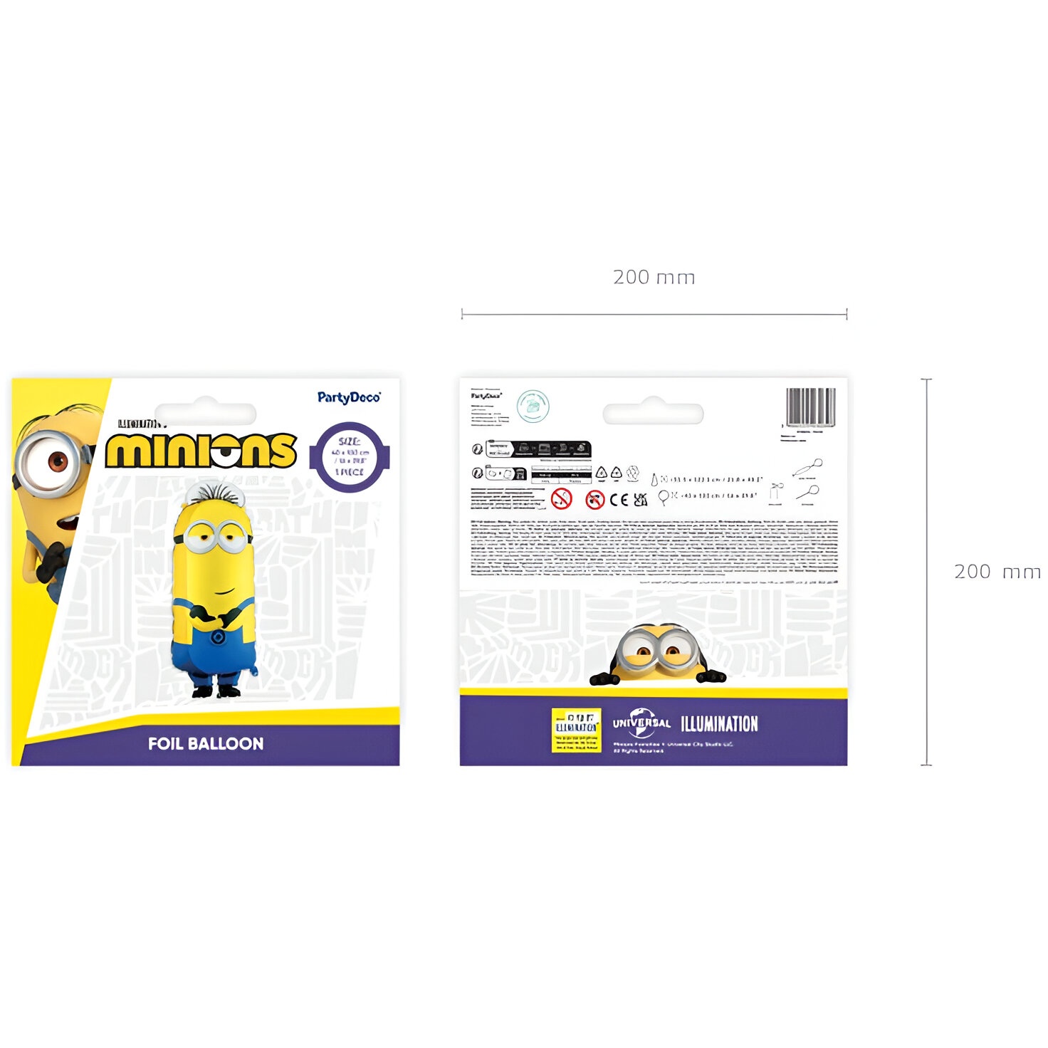 Folienballon in Form des Minions Tim mit blau-gelber Farbgebung und glänzender Oberfläche, die jeder Kinderfeier Freude verleiht. Vor dem Aufblasen misst er etwa 55,5 x 122,5 cm und aufgeblasen erreicht er etwa 40 x 100 cm. Sie können ihn je nach Bedarf mit Luft oder Helium befüllen; das Ventil ist selbstverschließend für ein schnelles und sicheres Verschließen. Er verfügt über integrierte Ösen, mit denen Sie ihn einfach aufhängen oder befestigen können, um die Dekoration stabil zu halten.