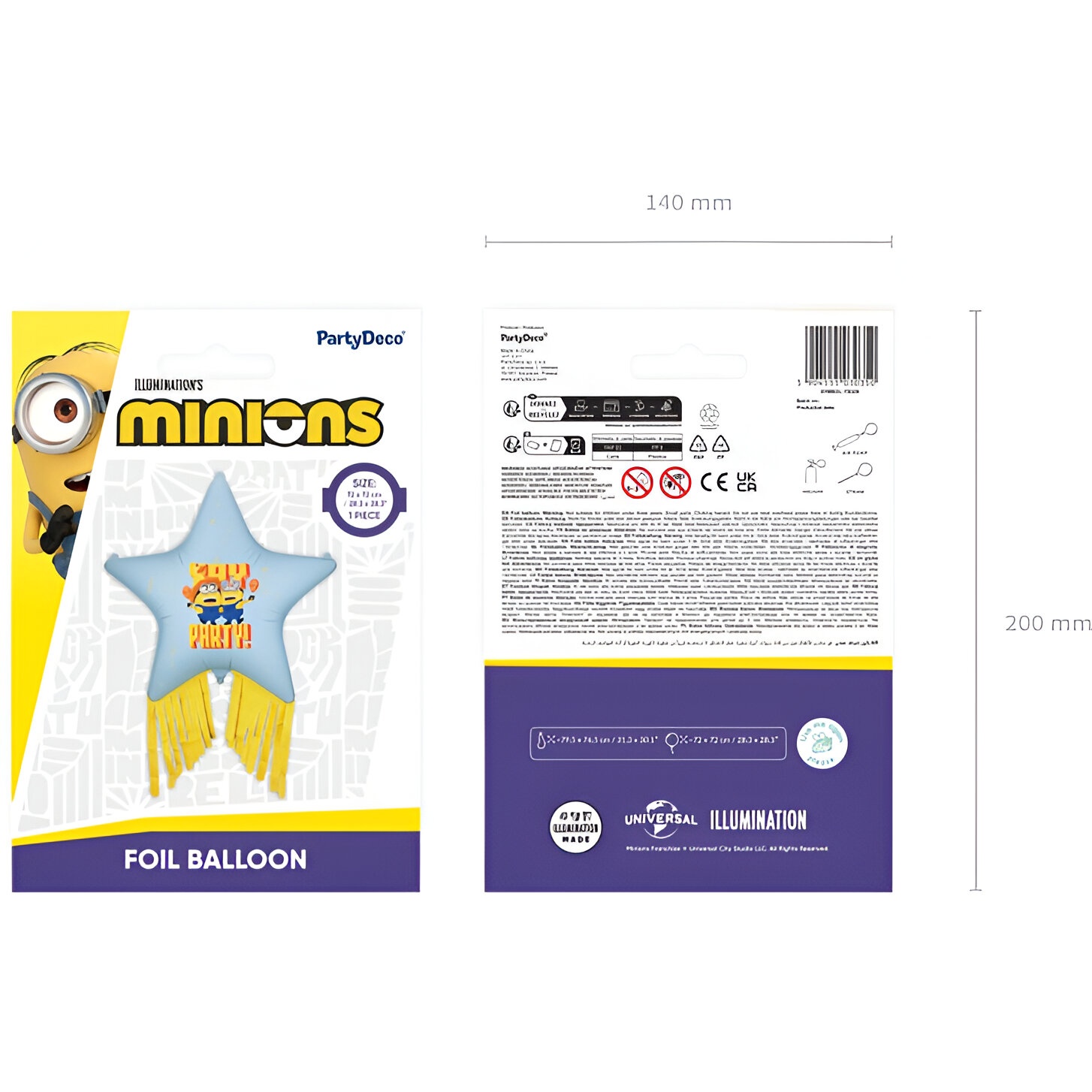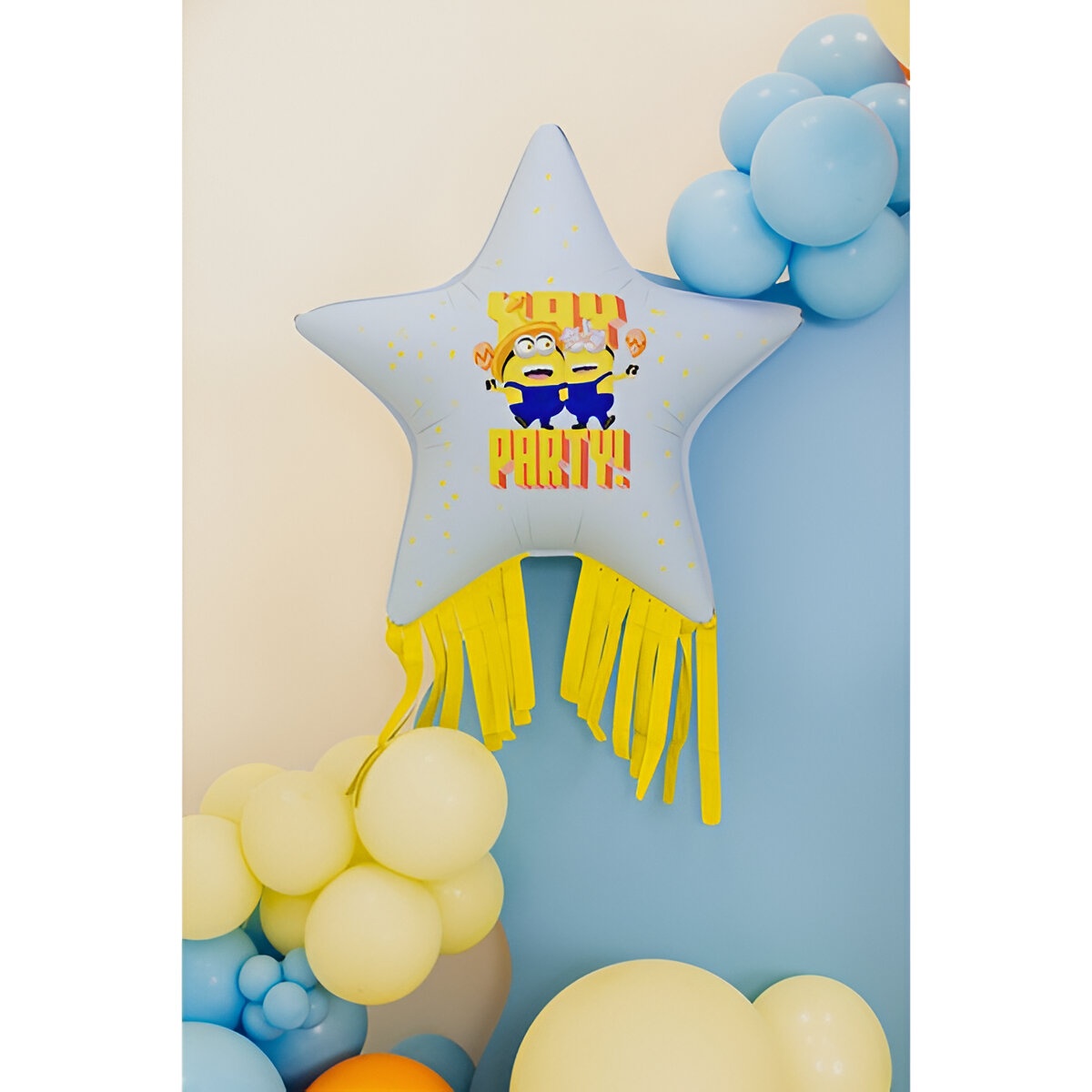 Dieser sternförmige Ballon mit fröhlichem Minions?Motiv verleiht Kinderfeiern eine lebhafte, fröhliche Note. Die angebrachten Fransen erzeugen Bewegung und ein festliches Erscheinungsbild, das in jeder Dekoration auffällt. Der Ballon lässt sich mit Luft oder Helium befüllen und wird mit einem Strohhalm zur einfachen manuellen Befüllung geliefert; ca. Größe nach dem Aufblasen: 72 x 72 cm.