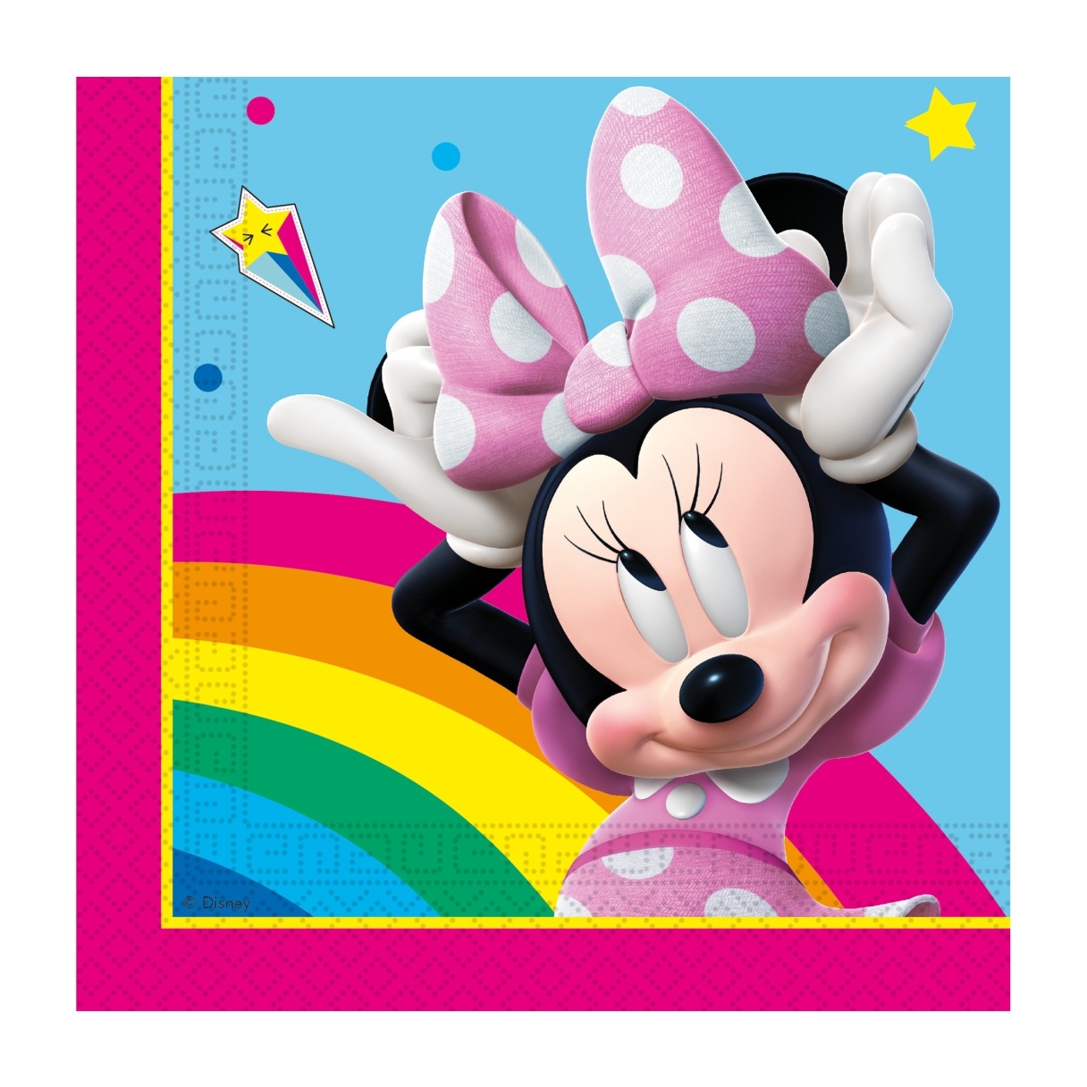 Bringen Sie mit diesen Servietten im ikonischen Minnie-Design und dem fröhlichen Regenbogen Farbe und Spaß in jede Kinderfeier. Das zweilagige Produkt vereint Weichheit und Stabilität für eine praktische Nutzung am Tisch. FSC-zertifiziert und aus Papier mit verantwortungsbewusster Herkunft gefertigt. Der lebendige, wiedererkennbare Stil wird die Kleinen begeistern.