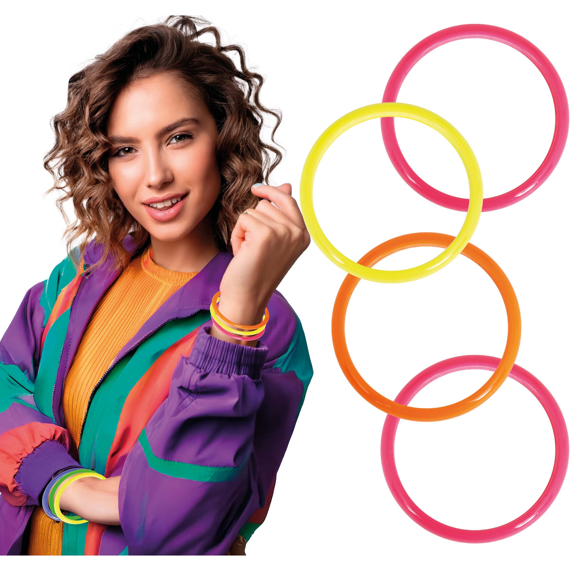 - Set mit 4 neonfarbenen Armbändern in verschiedenen Farben für einen sofortigen Retro-Look.