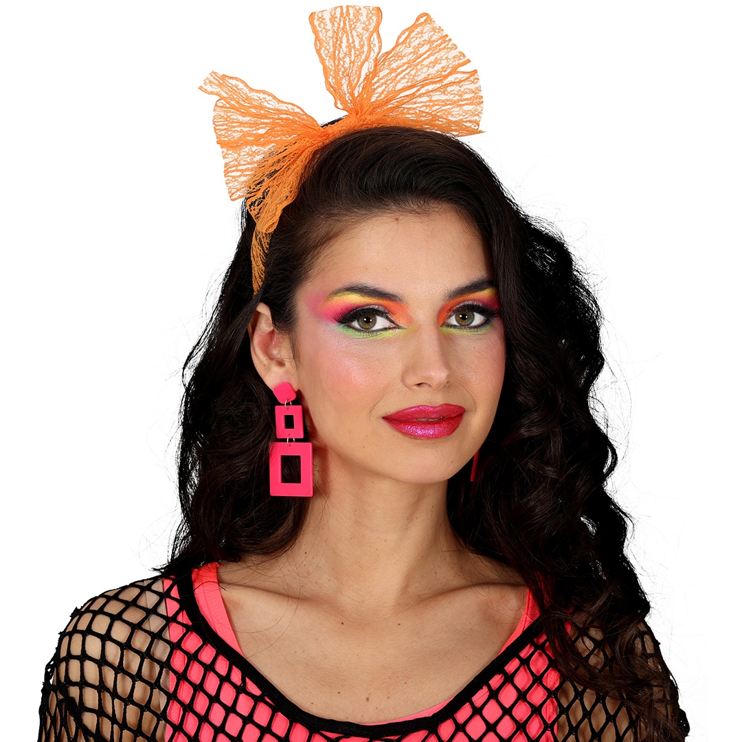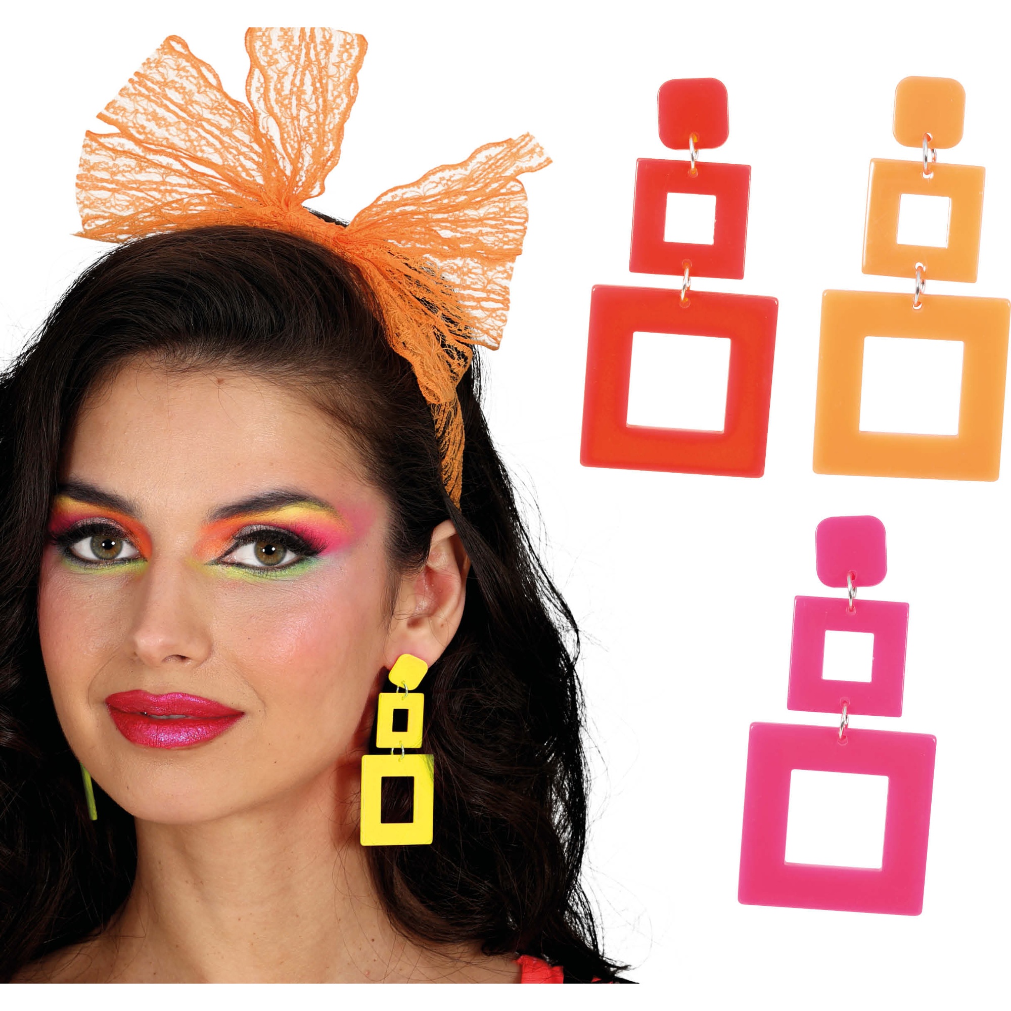 Ohrringe, inspiriert an den 80ern, mit geometrischem Design und leuchtenden Neonfarben, die einen retrohaften, auffälligen Akzent setzen. Perfekt, um Kostüme, Looks im 70er?Stil und Motto?Partys zu vervollständigen. Das leichte Design bietet hohen Tragekomfort bei großem visuellen Effekt - ideal für Karneval, Photocalls und Veranstaltungen, bei denen Sie auffallen möchten. Kombinieren Sie sie mit farbenfrohem Make?up und Accessoires für ein authentisches und verspieltes Gesamtbild.