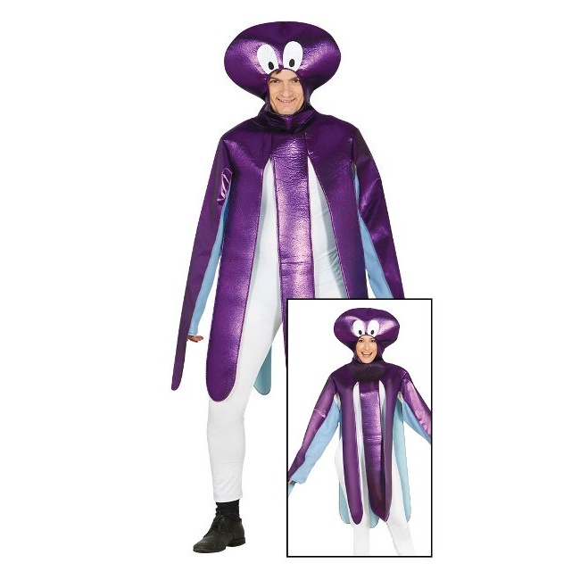 Lustiges Oktopus-Kostüm in leuchtendem Lila. Das Kostüm besteht aus den 8 Beinen des Oktopus und einer Kapuze mit Augen, die den Kopf des Tieres simuliert.