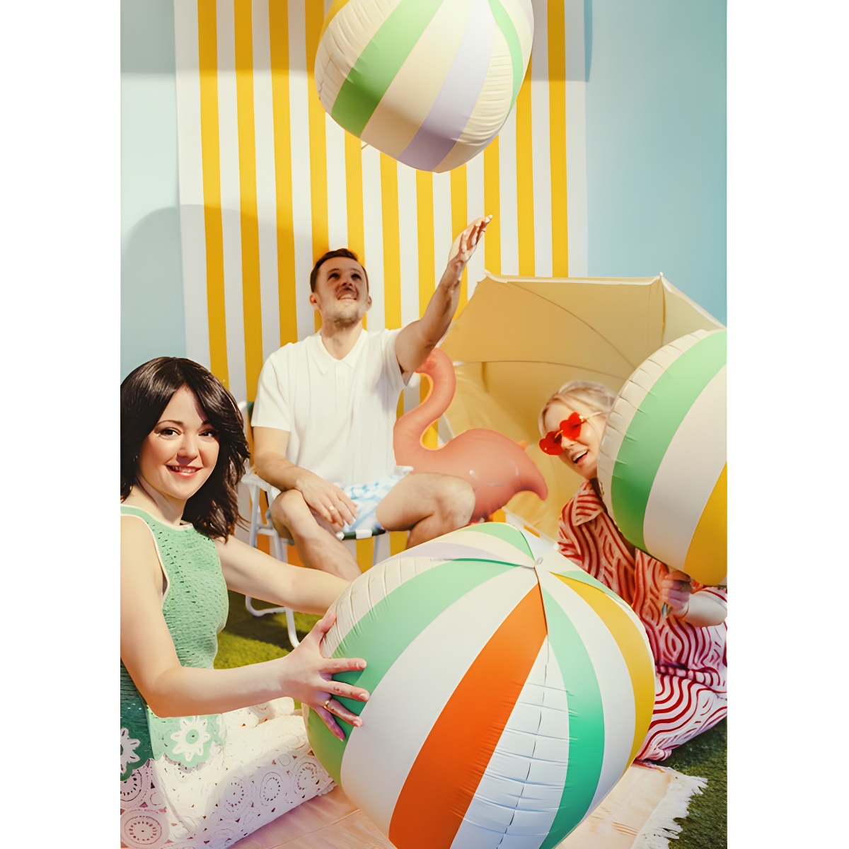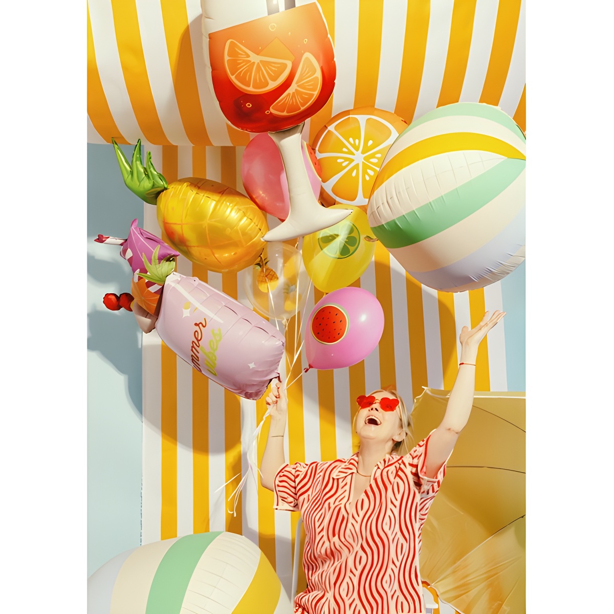 Folienballon mit einem fröhlichen, mehrfarbigen Streifenmuster, das jeder Feier eine moderne, festliche Note verleiht. Seine runde Silhouette und die zarten Pastellfarben machen ihn zum idealen Blickfang für Geburtstage und Events.