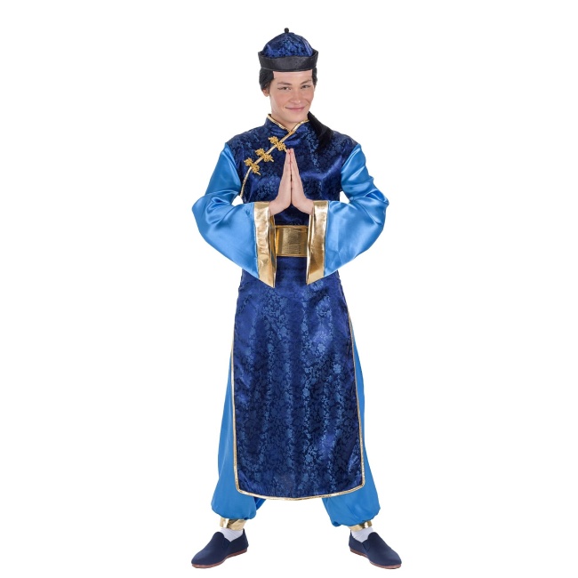 Es besteht aus einer blauen Tunika mit einer Art von Kobaltblauem Brustpanzer, verziert mit goldenen Linien und Rändern an den weiten Ärmeln und am Kragen. Es is einfach an- und auszuziehen, dank eines Reißverschlusses im Rücken und der Ärmel. Ergänzt wird es durch eine goldene Schärpe, eine orientalische Stoffmütze und eine blaue Hose mit elastischem Bund.