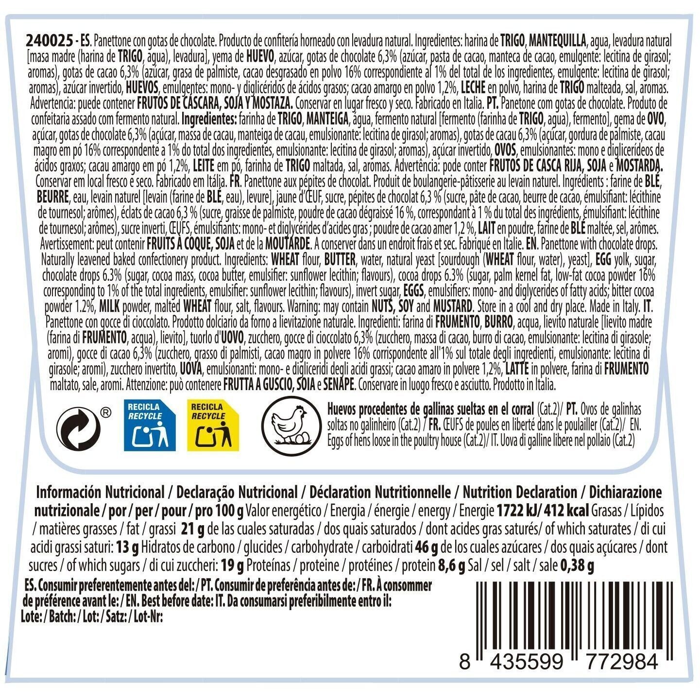 - Allergene: Getreide mit Gluten und Derivate, Nüsse und Derivate, Ei und Derivate, Milch einschließlich Laktose und Derivate, Senf und Derivate, Soja und Derivate.