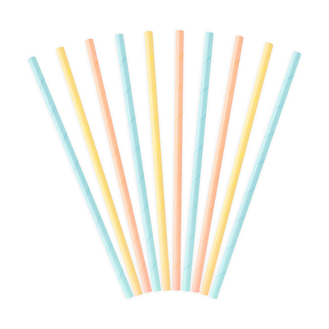 Dieses Produkt enthält 10 Papierstrohhalme in verschiedenen Farbtönen. Sie finden 4 in Pastellblau, 3 in Pastellgelb und 3 in Pastellorange. Sie können genauso verwendet werden wie herkömmliche Strohhalme.
