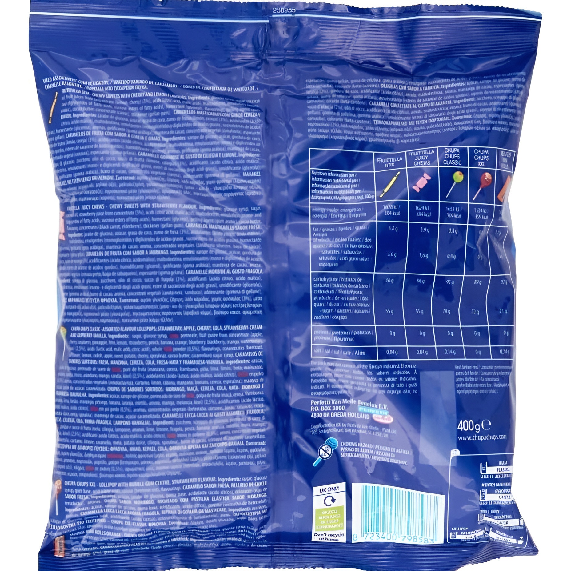 - Enthält: kaubare Bonbons mit Kirsch- und Zitronengeschmack (Fruittella Stix), kaubare Erdbeerbonbons (Fruittella Juicy Chews), Chupa Chups in verschiedenen Geschmacksrichtungen (Chupa Chups Classic), mit Kaugummi gefüllte Erdbeer-Chupa Chups (Chupa Chups chicle), Mentos Mini Rolls Orange (Mentos Mini Rolls Orange).