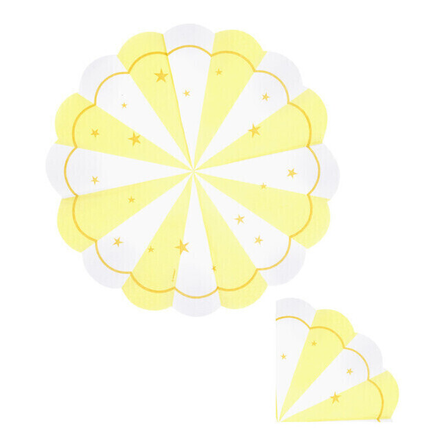 Packung mit 12 dreieckigen Papierservietten in weiß und pastellgelb gestreift mit kleinen Sternen.
