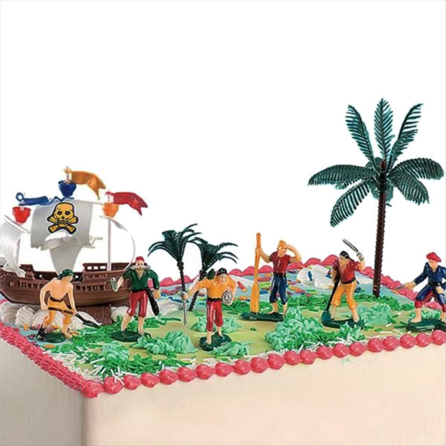 Dieses Produkt besteht aus 6 Filibuster-Figuren im tropischen Stil, 3 unterschiedlich großen Palmen und einem Piratenschiff mit dem Jolly Roger in Goldfarbe auf den Segeln. Jede Einheit wird mit einem praktischen Sockel geliefert, der das Aufstellen auf der Torte erleichtert.