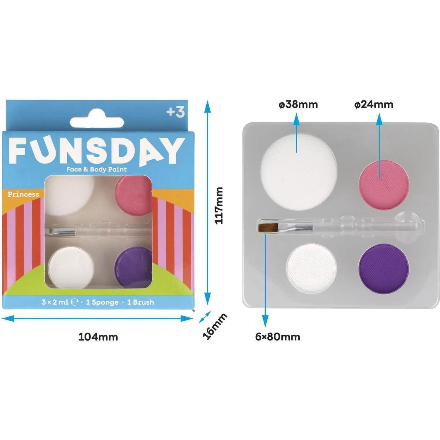- Set mit 3 Gesichtsschminken in Prinzessinnen-Farben (Lila, Weiß und Rosa) sowie Pinsel und Schwamm. Leicht aufzutragen für leuchtende, langanhaltende Ergebnisse. Perfekt für Verkleidungen, Partys, Festivals, Karneval und Halloween.