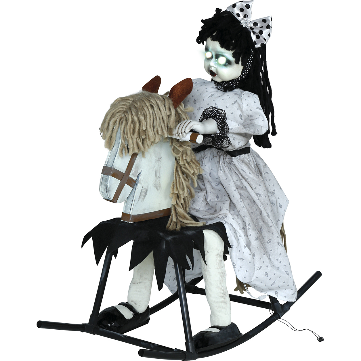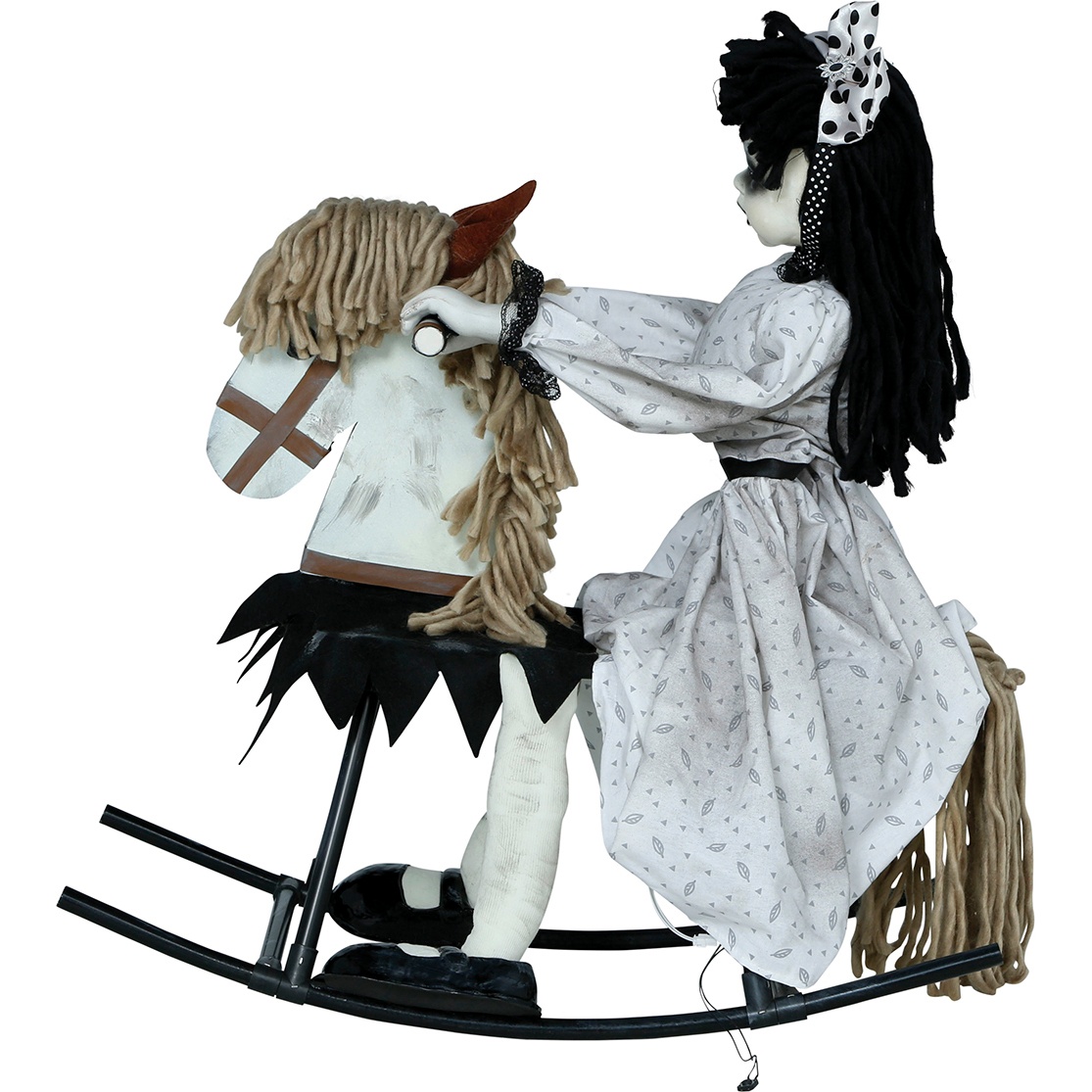 Puppe auf einem Schaukelpferd mit Licht, Ton und Bewegung, 70 cm
