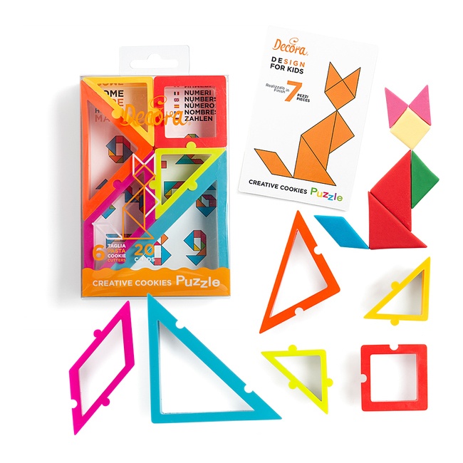 Set mit 6 Ausstechern und 20 Karten. Ideal, um Formen in jede Art von Teig zu schneiden und sie zu kombinieren, um eine unendliche Anzahl von Figuren zu bilden.
