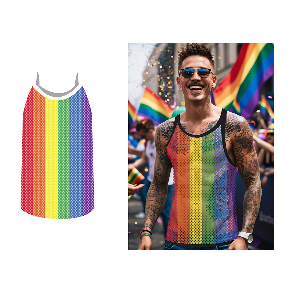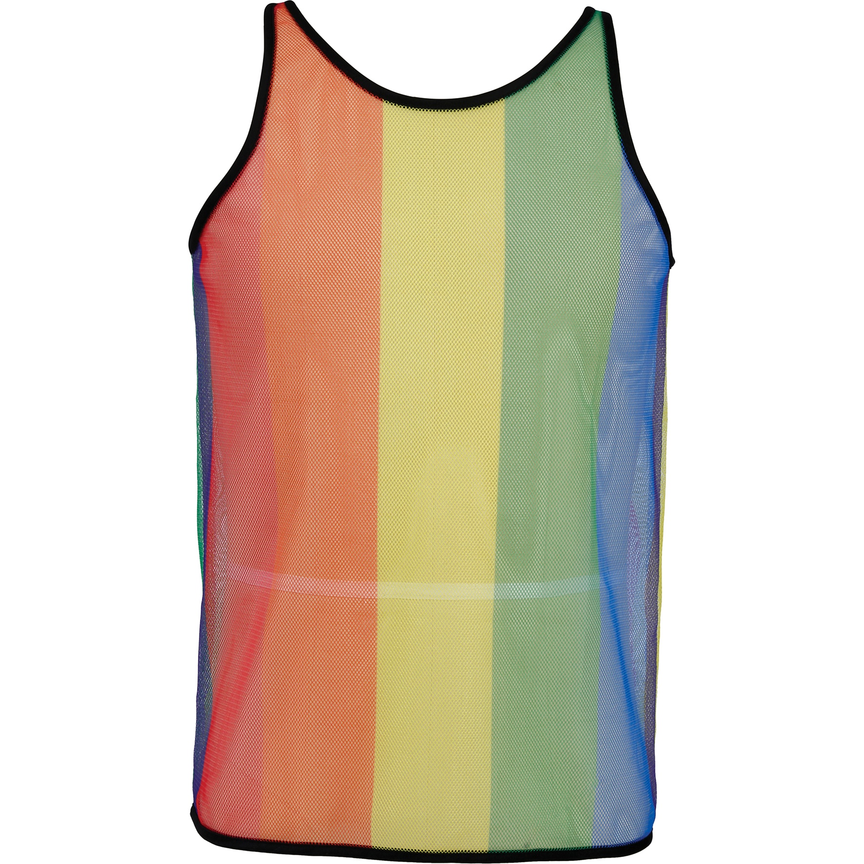 Netztop mit Regenbogenstreifen - perfekt, damit Sie bei Pride-Veranstaltungen und Paraden herausstechen. Das leichte Polyester-Netzgewebe ist besonders atmungsaktiv und lässt sich solo oder als Lage über anderen Kleidungsstücken tragen. Der Unisex-Schnitt für Erwachsene passt zu verschiedenen Stilrichtungen. Auffälliges, farbenfrohes Design für kreative und festliche Looks.