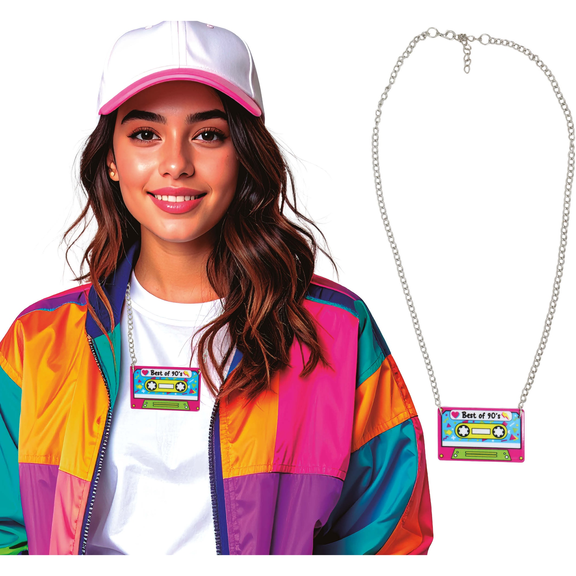 Halskette mit Kassetten-Ästhetik im 90er-Stil, die jedem Outfit eine nostalgische und verspielte Note verleiht. Der farbenfrohe Anhänger reproduziert das klassische Band-Design in lebendigen Tönen und ist ideal, wenn Sie ein Accessoire mit Persönlichkeit suchen.