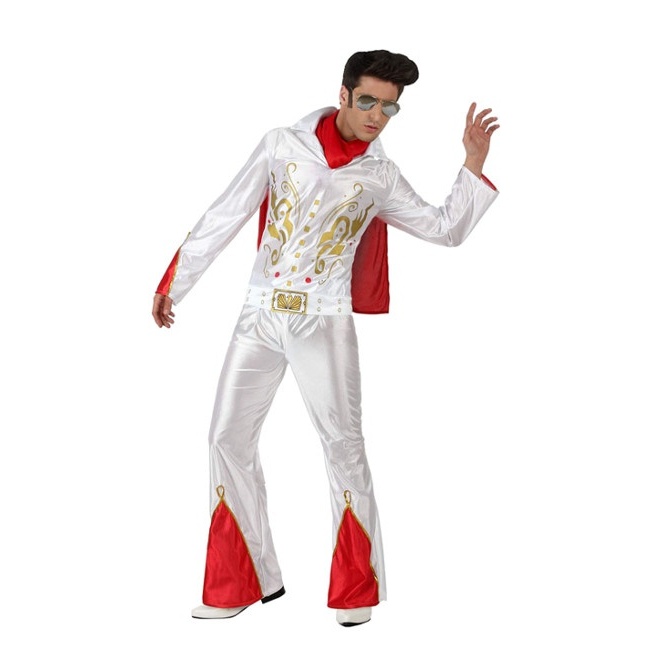 Das Kostüm besteht aus einem fabelhaften T-Shirt und einem Hosenset in einem schönen, hellen Weiß. Die goldenen Details und roten Teile verleihen dem Kostüm einen originellen Touch. Die leicht ausgestellte Form der Hose versetzt uns zurück in das fantastische 20. Jahrhundert, in dem diese kulturelle Ikone viele Jahre lang triumphierte.