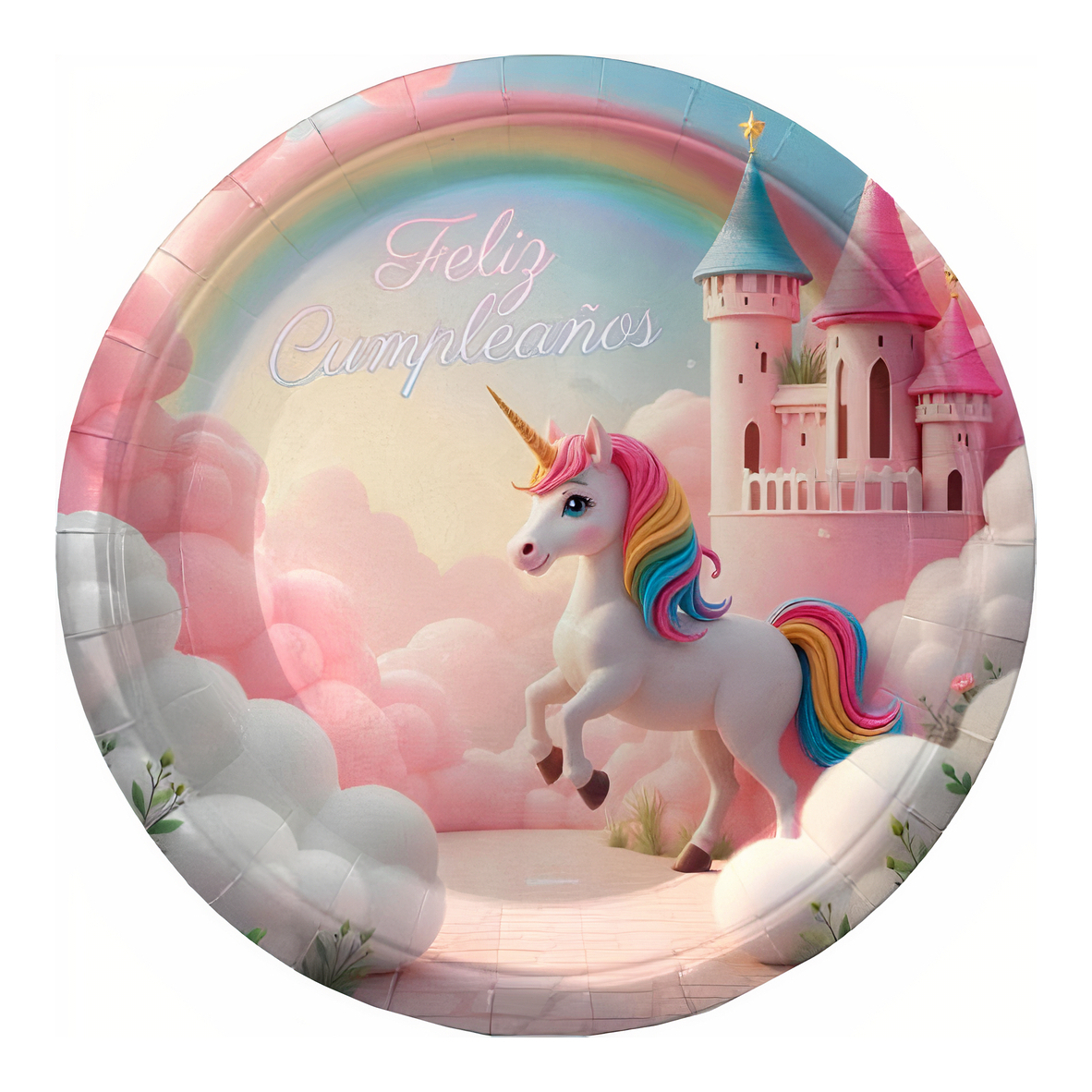 Ideal für Ihre Kindergeburtstagsfeier: bezaubernde Einwegteller mit Einhorn-, Schloss- und Regenbogenmotiv sowie dem Schriftzug 'Feliz Cumpleaños'.